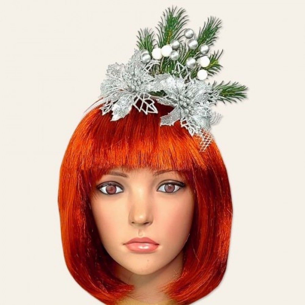 Інтернет магазин Подарок-тут! пропонує Вам купити оптом по-справжньому зимовий та стильний обідок з гілочками ялинки та декоративними квітами, повністю ручної роботи. Чарівний різдвяний обідок – ошатний аксесуар для фотосесії, корпоративу, створення унікального образу чи будь-якої іншої урочистості. Срібні декоративні квіти пуансетії з литими гілочками ялинки виглядають просто чудово та дуже святково, а також створюють святковий настрій та ідеально впишуться у новорічні урочистості. Композиція надійно закріплена на пластиковому білому обідку універсального розміру, прикрашеному білою стрічкою репсової. Ця новорічна прикраса на голову зробить Ваше вбрання на будь-якій святковій вечірці і буде родзинкою образу, як вишенька на торті.