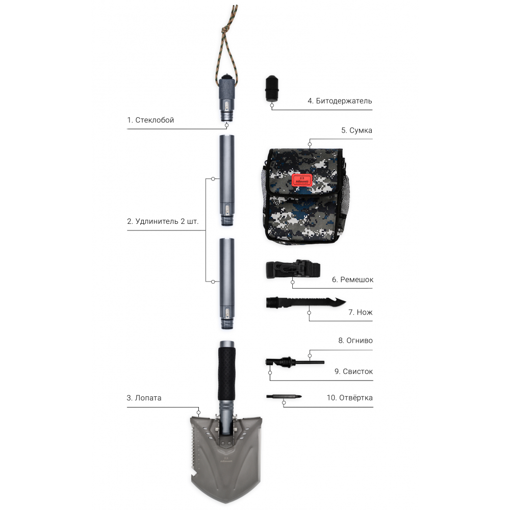 Доступний інструментарій даної моделі включає у собі ряд пристосувань, які є базовими для портативної туристичної лопати і зустрічаються в інших модифікаціях лопат Adimanti.