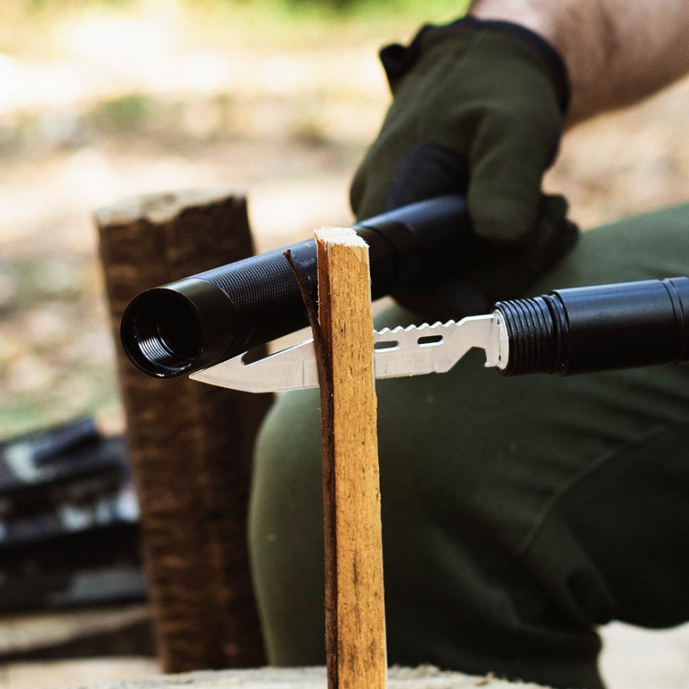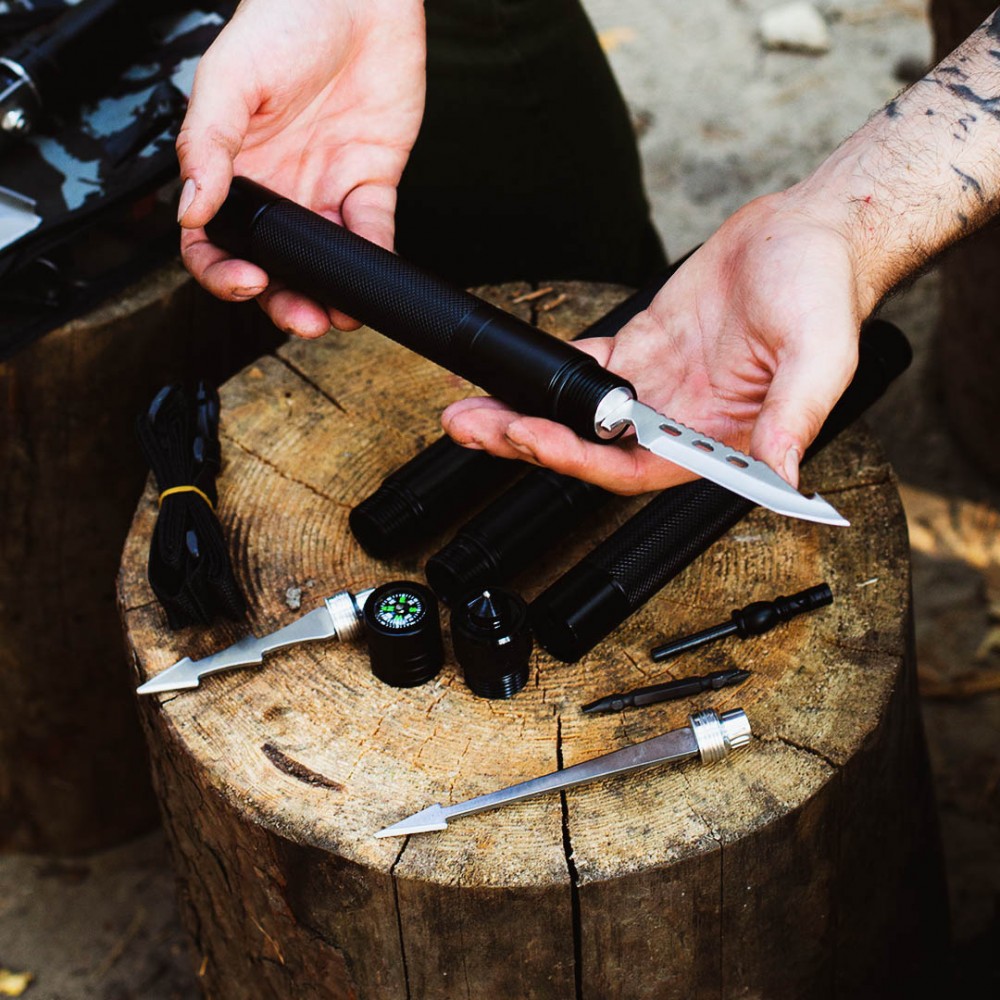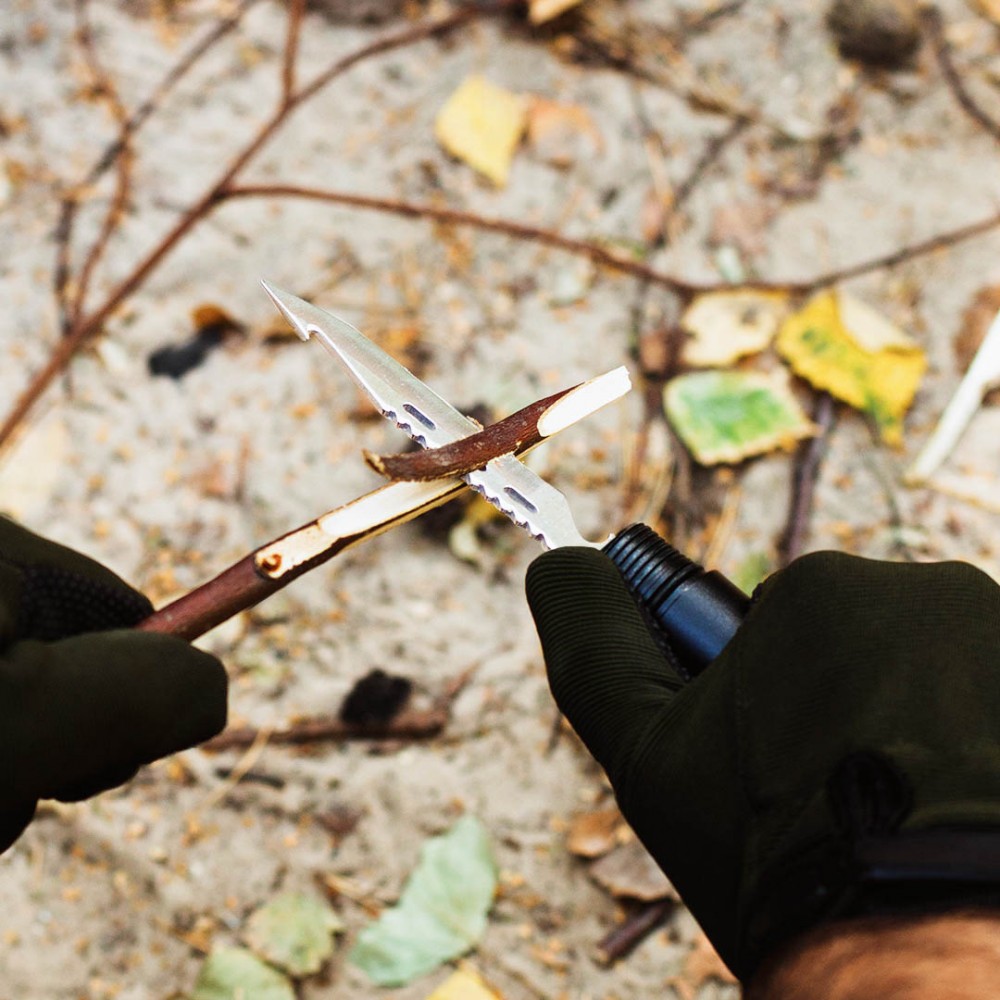 Модель HK001 - це мультифункціональний виріб, який виключає необхідність носити з собою важкий набір інструментів, без якого не обійтися під час відпочинку на природі. Воно включає один основний і шість додаткових інструментів, що складають оптимальний набір для виживання далеко від цивілізації: