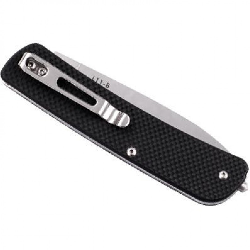 Накладки на рукоять виготовлені з зносостійкого полімерного матеріалу G10, який славиться своєю міцністю і довговічністю. А завдяки фактурної поверхні і ергономічною формою рукояті, модель L11 зручно утримувати практично будь хватом. В асортименті нашого інтернет-магазину представлено 3 варіації даного ножа: з чорними, коричневими і темно-зеленими накладками на рукоять.
