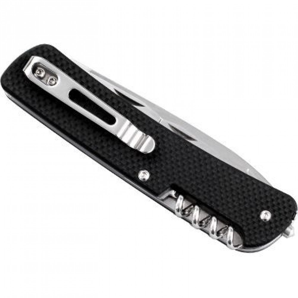 Рукоятка цього складного ножа порожня всередині, щоб там могли зберігатися всі робочі інструменти. Зовні вона прикрашена двома накладками з G10. Цей композит широко використовується в ножовий промисловості, оскільки він дуже вдало поєднує малу вагу з високою міцністю. На сонці такий матеріал не вигорає, а не вбирає воду. До того ж, він досить легко обробляється, щоб виробники могли надати рукоятці зручну форму. Рельєфна дрібна накатка на накладках не дає ножу ковзати в руках. Що стосується кольору, то покупцям доступно відразу три варіанти: чорний, зелений та коричневий.