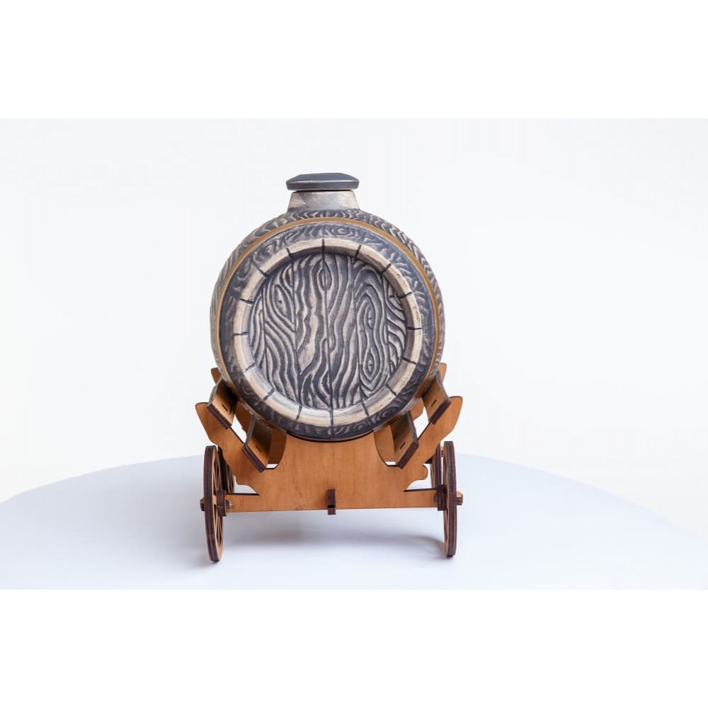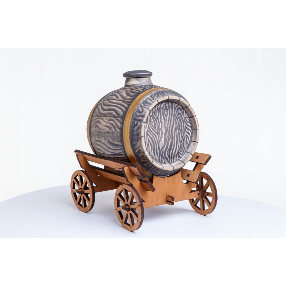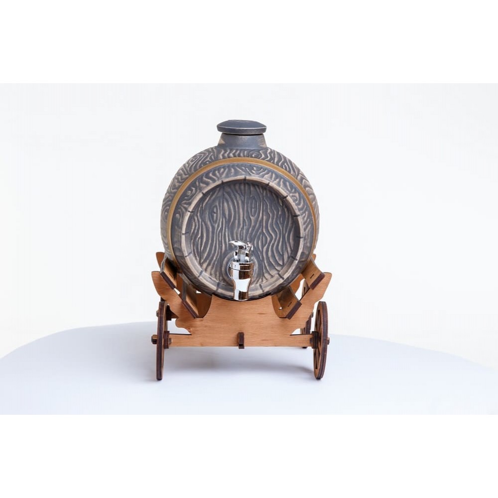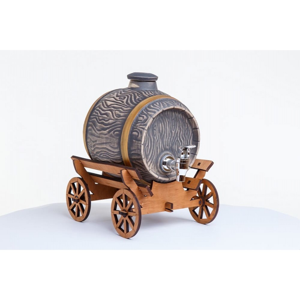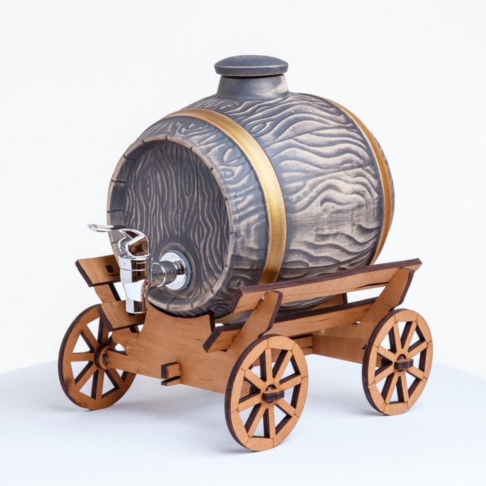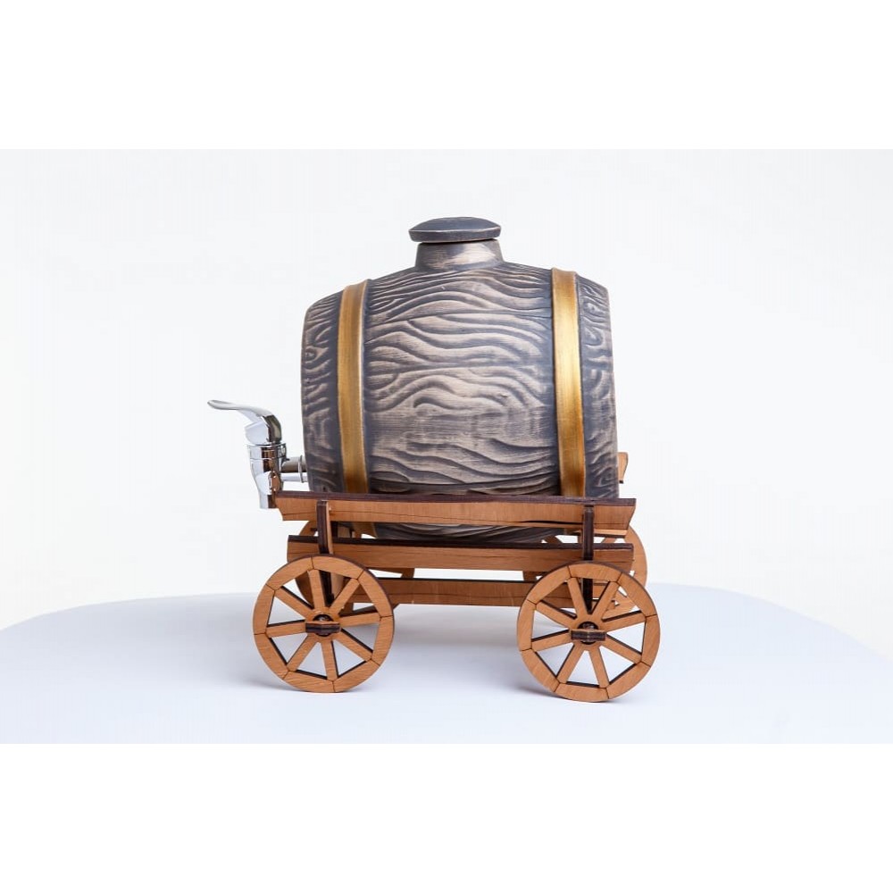 Керамічна бочка з краником виконана з текстурою багатовікового дуба та золота. Поміщена на дерев’яний віз ручної роботи майстрів.