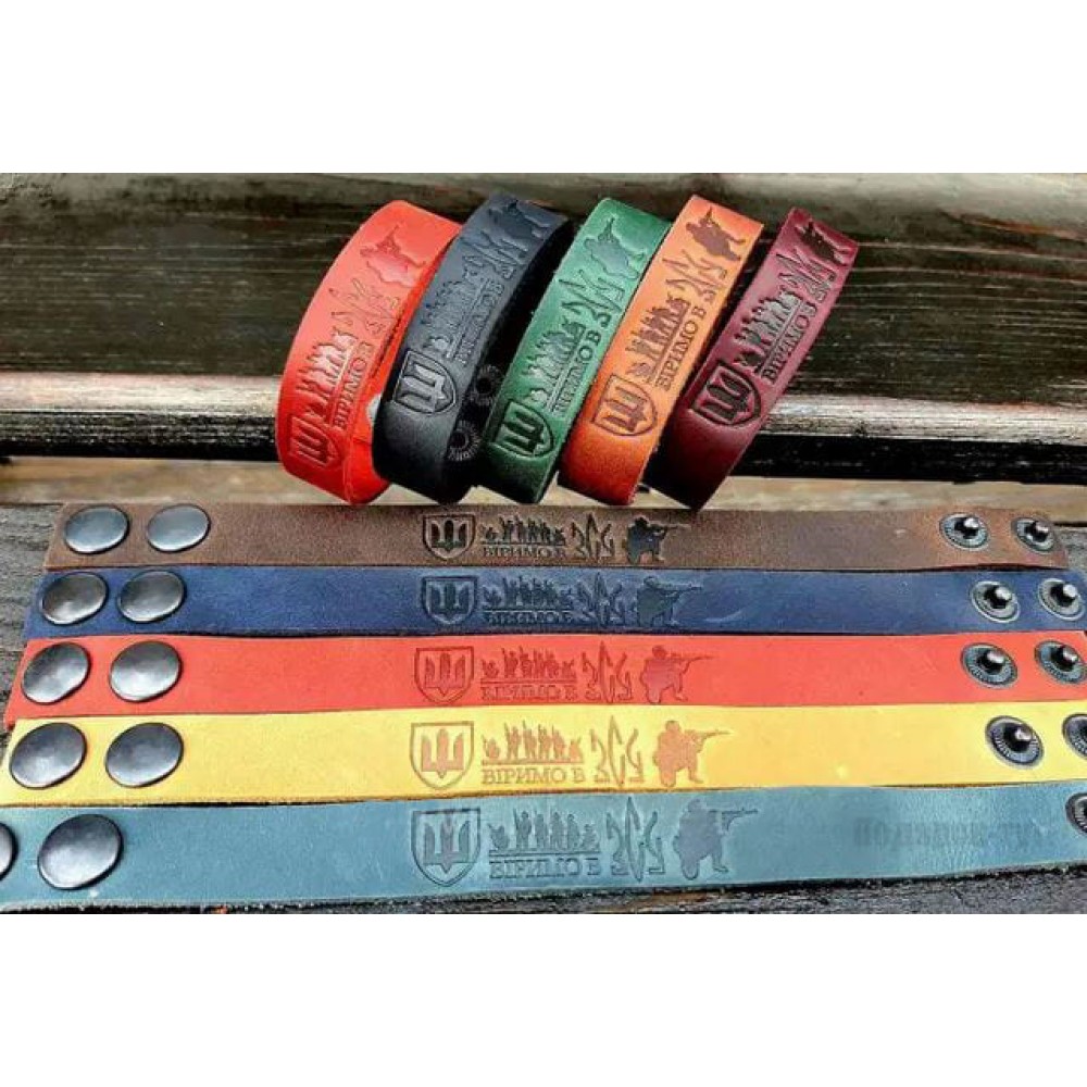 Браслети на руку з високоякісної натуральної шкіри, прикрашені написом "Віримо в ЗСУ". Допоможуть вам виявити свою підтримку та віру в сили України.