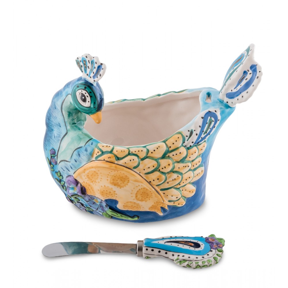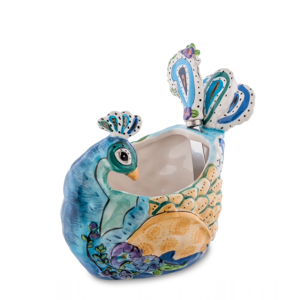 Масленка ''Павлин'' высотой 16 см.; Павлин приносит счастье и радость в дом, считается символом гордости и красоты. Огромное количество "глаз" на его хвосте ассоциируется с мудростью. Собственно собственным неподражаемым хвостом павлин оберегает, и также притягивает к главе дома различные почести.