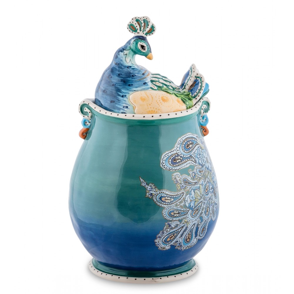 Емкость для сыпучих пр-в ''Павлин'' высотой 29 см.; Павлин приносит счастье и радость в дом, считается символом гордости и красоты. Огромное количество "глаз" на его хвосте ассоциируется с мудростью. Собственно собственным неподражаемым хвостом павлин оберегает, и также притягивает к главе дома различные почести.
