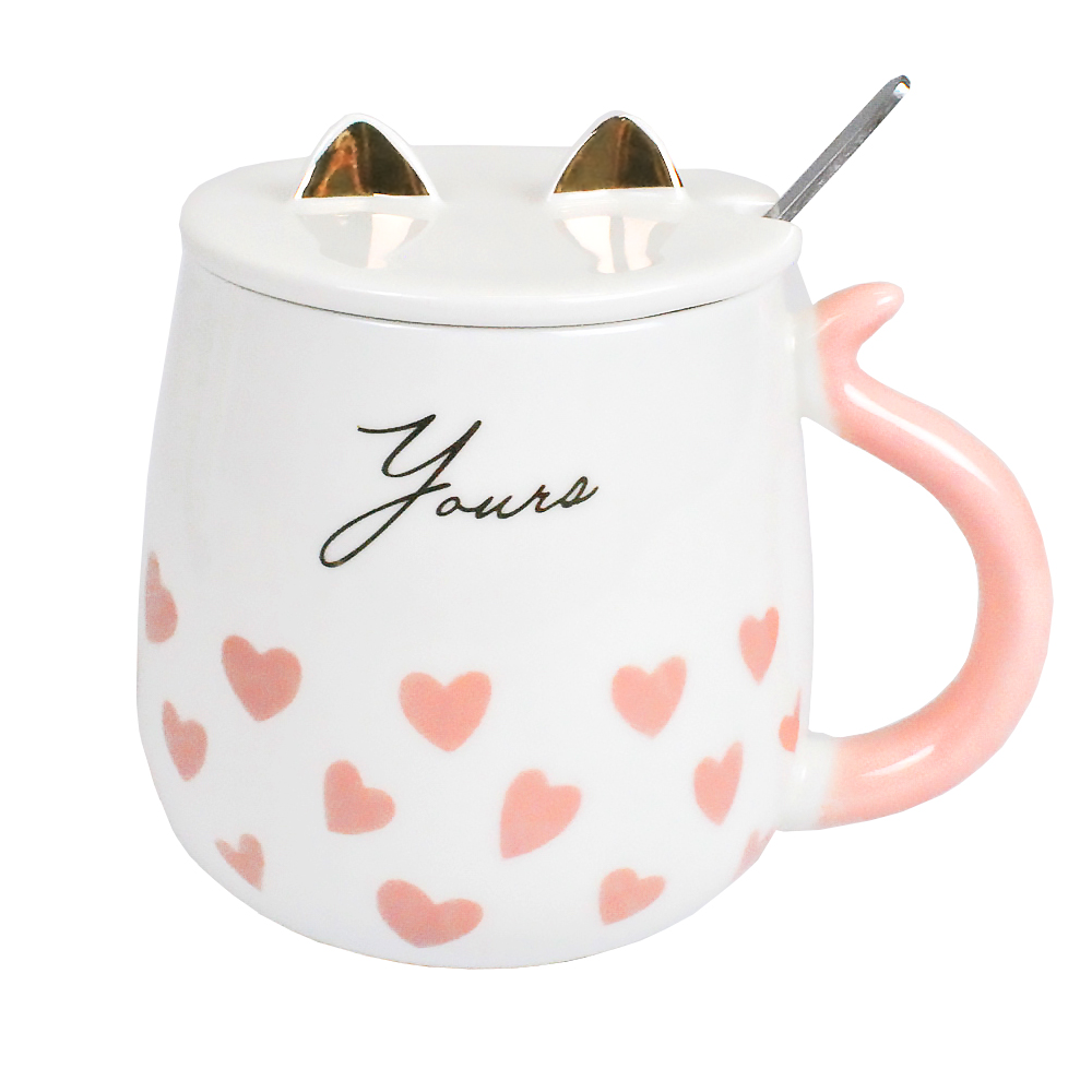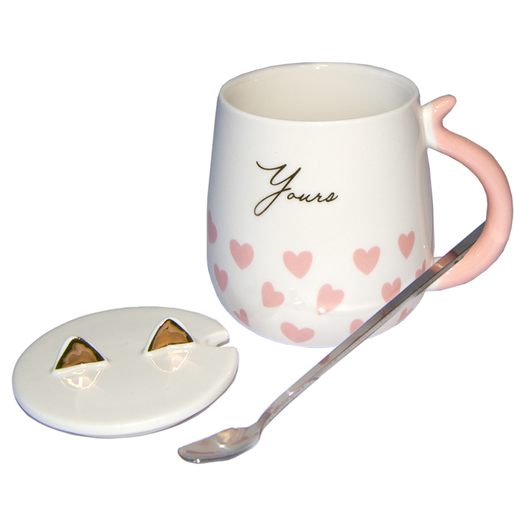 Чашка Cat-Youre з кришкою та ложкою - чашка в подарунковій упаковці з кришечкою та ложкою у комплекті. Кришка виконана в грайливій формі з вушками кішечки. На чашку напис англійською Youre і принт рожеві серця. Завдяки розмірам чашки та об'єму 450мл, власник зможете повною мірою насолодитися улюбленим напоєм. Таку чашку можна купити як особливий подарунок коханій та дорогій людині до будь-якого свята будь-то День народження, Новий рік, Різдво або 14 лютого (День усіх закоханих). Головна увага, а з такою чашкою увага буде забезпечена. Чашка знаходиться в подарунковій коробці. Великий вибір чашок та кухлів з яскравим та незвичайним дизайном для будь-якого приводу Ви можете купити в інтернет магазині Карнавал Жартів.