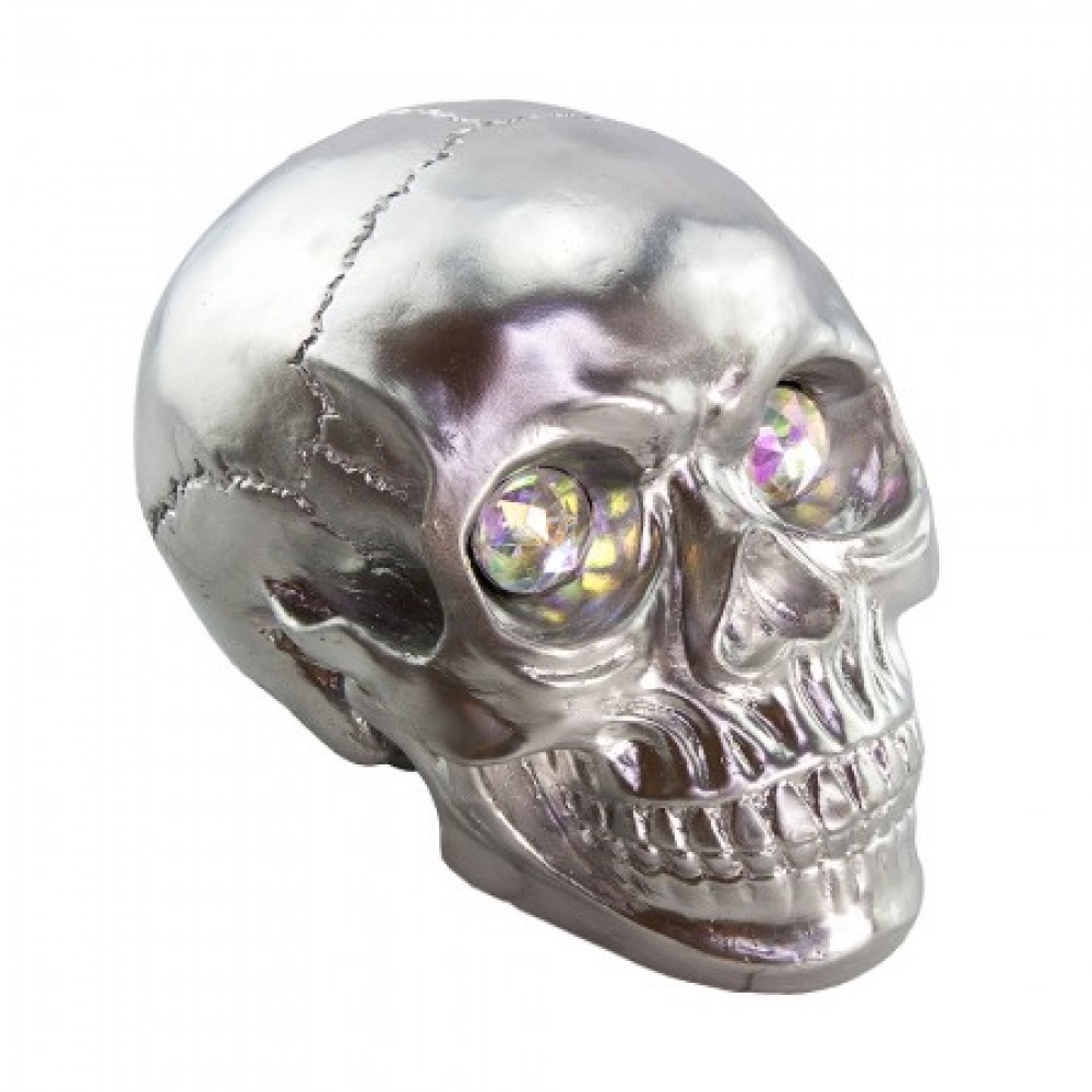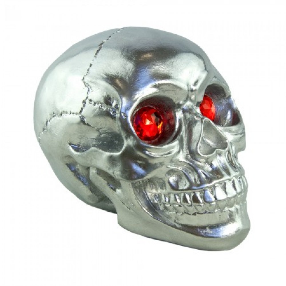 Череп скарбничка M (срібло) №8945 - креативна скарбничка у формі черепа срібного кольору оригінальний подарунок на Хеллоуїн. Особливо незвичайно та ефектно у скарбничці виглядають природні шви на стику кісток черепної коробки. Особливого шарму скарбничці додають очі у вигляді двох діамантів, що грають від світла різними кольорами. Череп порожнистий усередині, оскільки це скарбничка. У верхній частині потилиці є отвір для монет. Прямі поставки оригінальних скарбничок для Вашого магазину за найкращими цінами від інтернет магазину Карнавал Жартів.