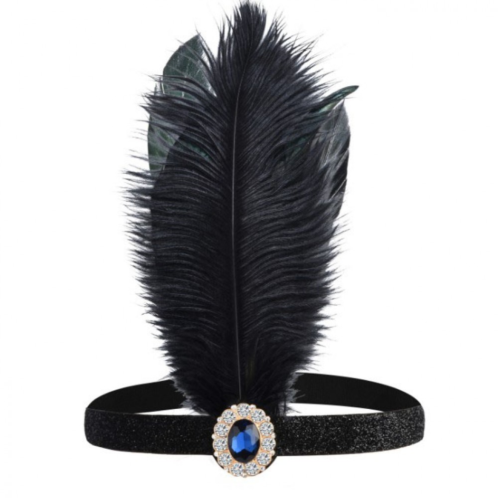 Чорна пов'язка з високим пером і синім «камінням» по центру виглядає так, ніби її щойно зняли з героїні фільму про епоху Гетсбі. Вузька блискуча стрічка м'яко облягає голову, а велике перо ефектно піднімається вгору, створюючи виразний силует. У центрі — овальний синій «кристал» в обрамленні прозорих страз, який надає красивий акцент і відразу привертає увагу.