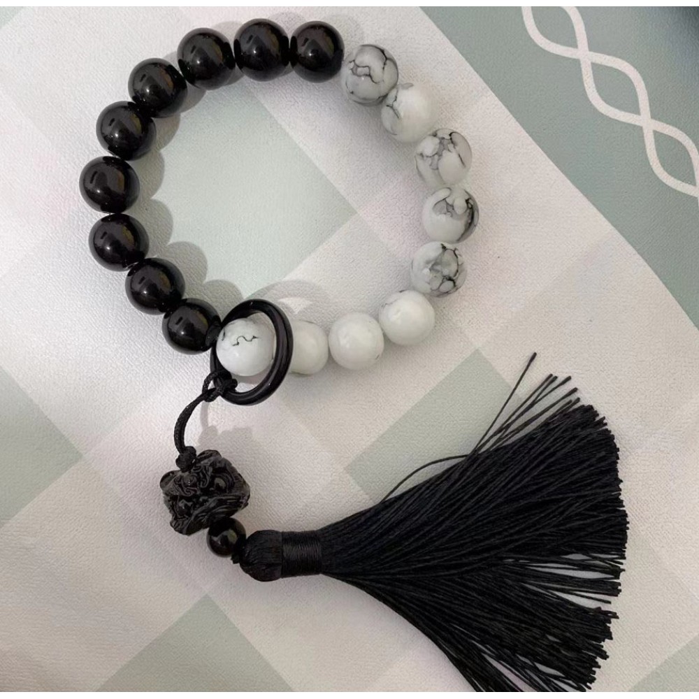 Чотки-браслет на руку з контрастними намистинами чорного та білого кольору з мармуровим візерунком, декоративною фігуркою лева та довгою чорною китицею. Аксесуар виконаний у східному стилі і підходить для повсякденного носіння, фотосесій, тематичних образів та подарунків.