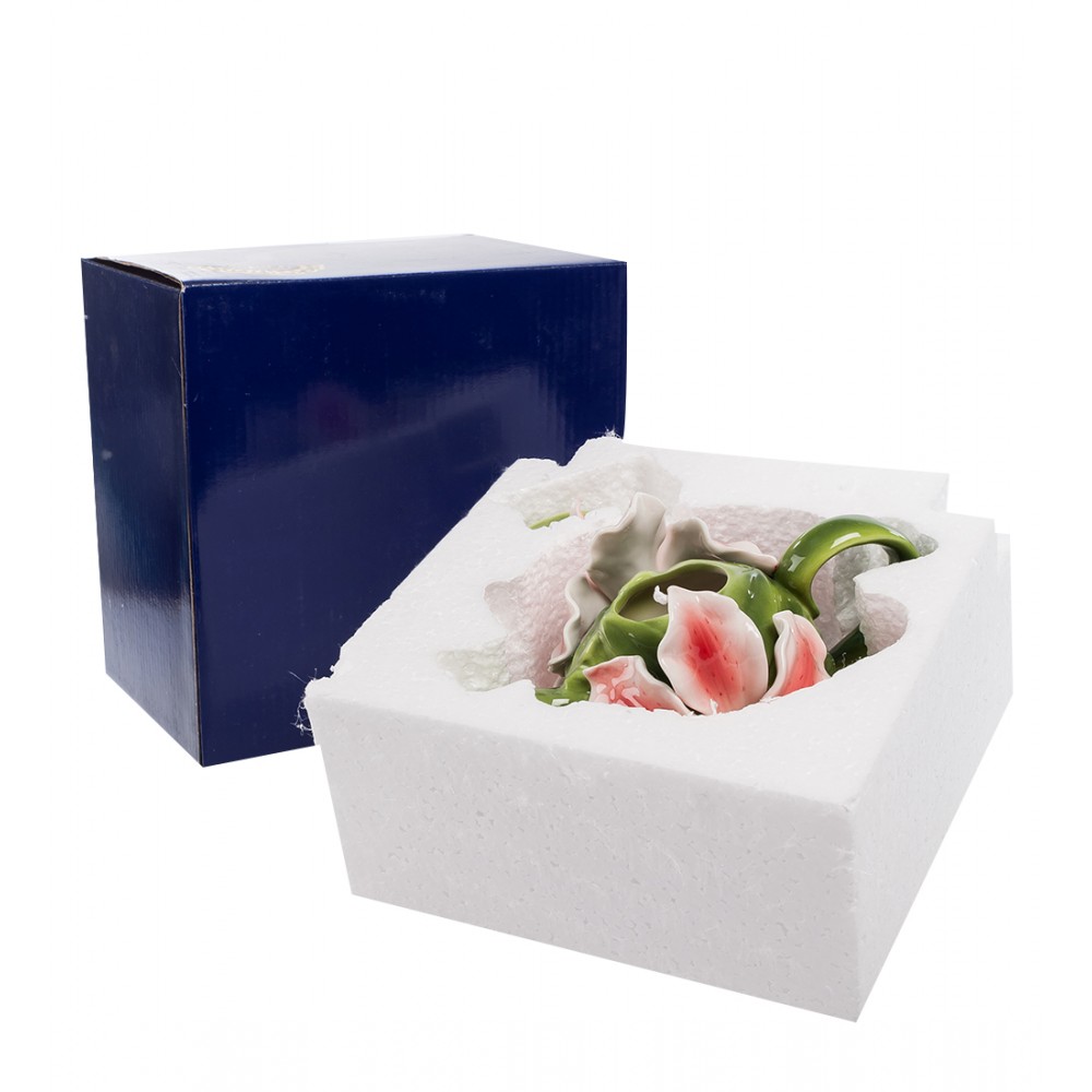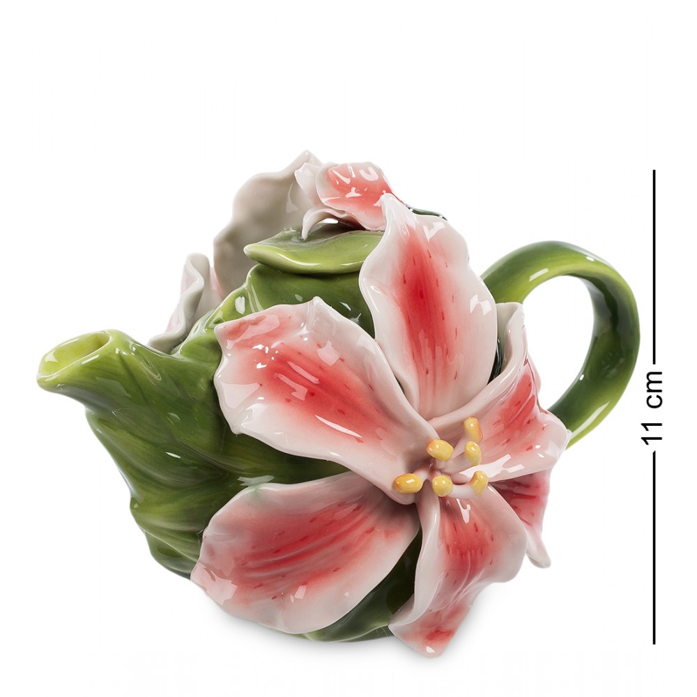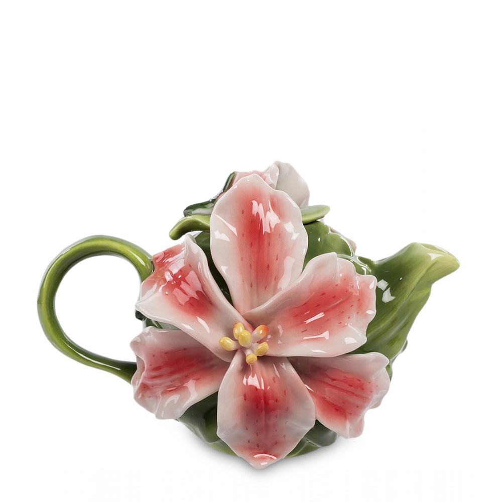 Чай превосходно впитывает запахи, и его часто ароматизируют лепестками цветов, получая своеобразные ароматные букеты. Именно об этом напоминает заварочный чайник, украшенный роскошными цветами лилии. С двух сторон на чайнике – по крупному цветку, крышка – зеленый листик с букетом цветка на нем. Кажется, от самого чайника уже исходит приятный аромат цветов. А уж если к нему добавится букет запахов самого чая, впечатление будет незабываемым. Такой чайник – прекрасное украшение любого стола, центр компании, собравшейся для чаепития. Или – превосходный подарок любителю чая.