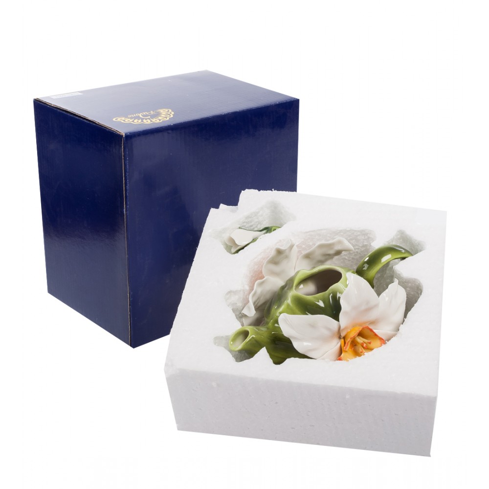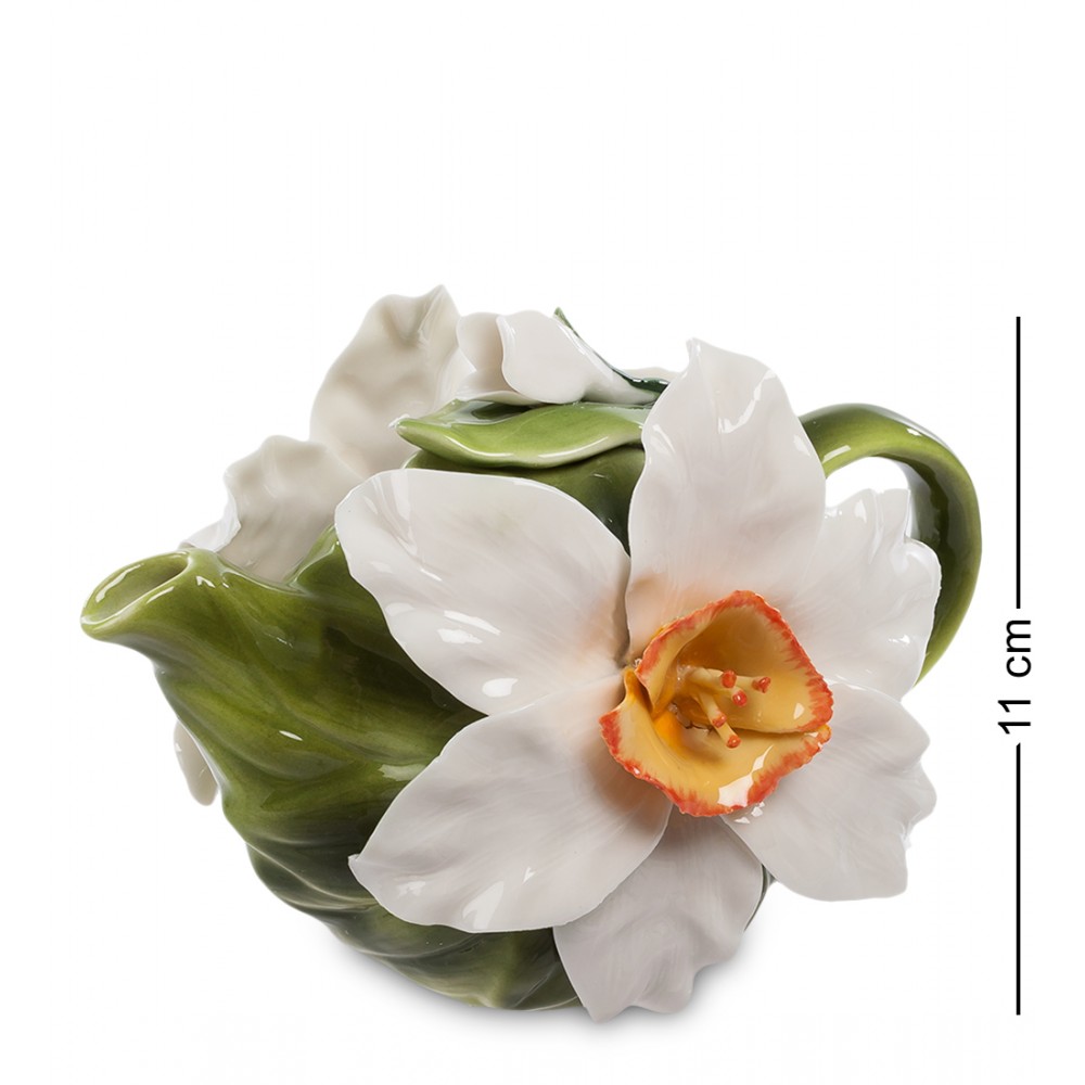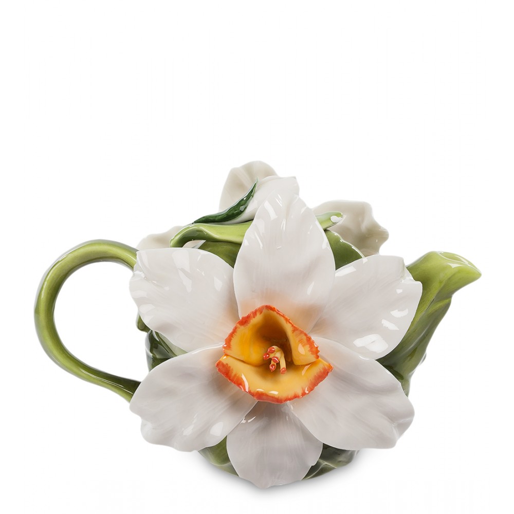 Украсить заварочный чайник крупными цветами нарцисса – великолепная идея! Чай вообще дружит с ароматами цветов – потому его и ароматизируют, добавляя натуральные лепестки. А в этом чайнике даже обыкновенный зеленый чай будет пахнуть нарциссами – ну, не может не издавать приятный запах такой богатый, полностью развернувший свои лепестки, цветок. За двумя нарциссами сам чайник почти не виден. Чтобы засыпать чай, надо дотянуться до маленького зеленого листика, взять его за черешок или за бутончик, поместившийся на нем сверху – такая вот здесь забавная крышечка. Ручка и носик чайника тоже притворяются стеблями растений. Это будет красивое чаепитие!