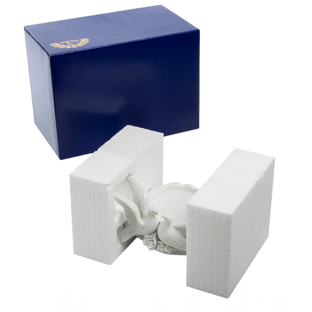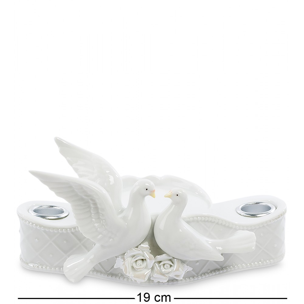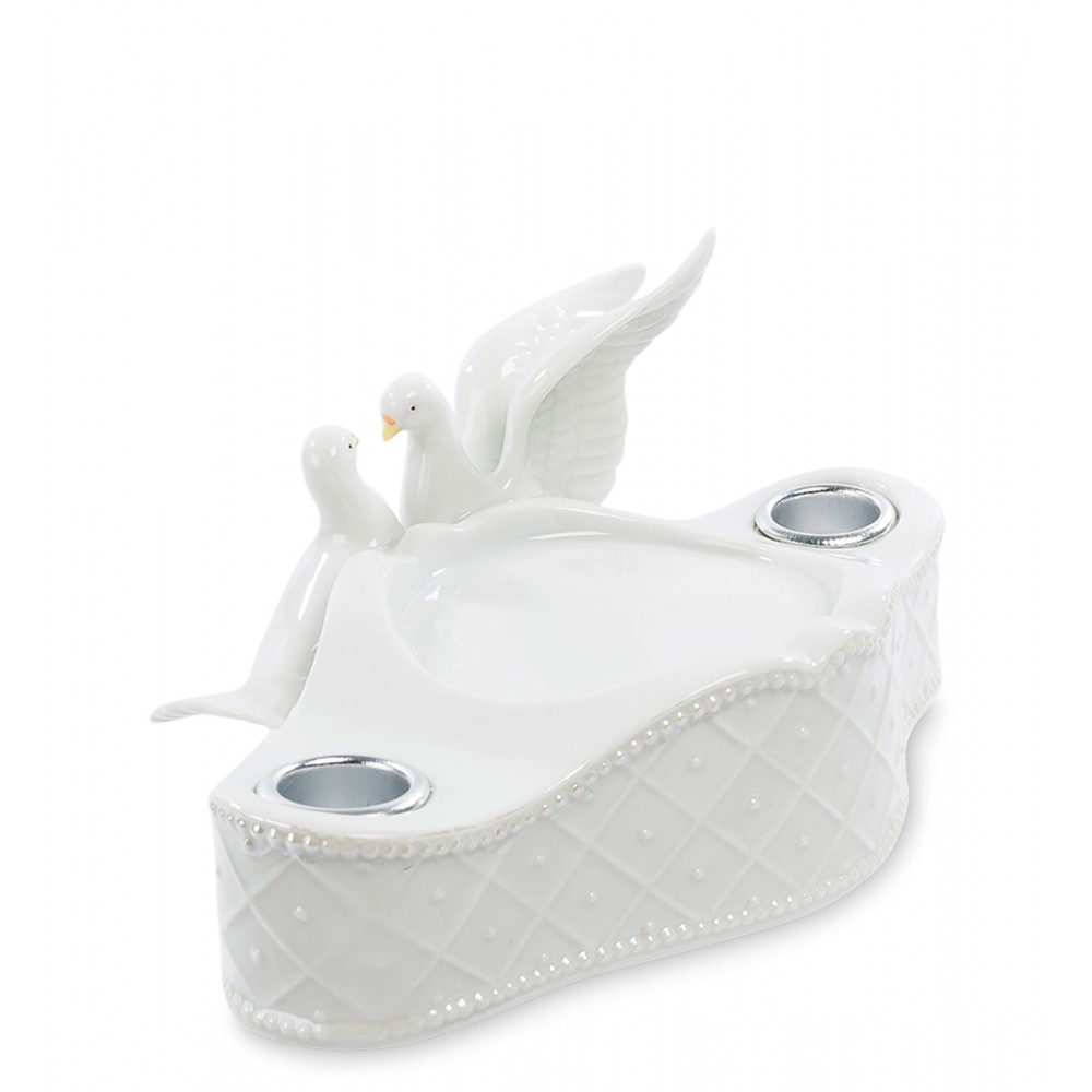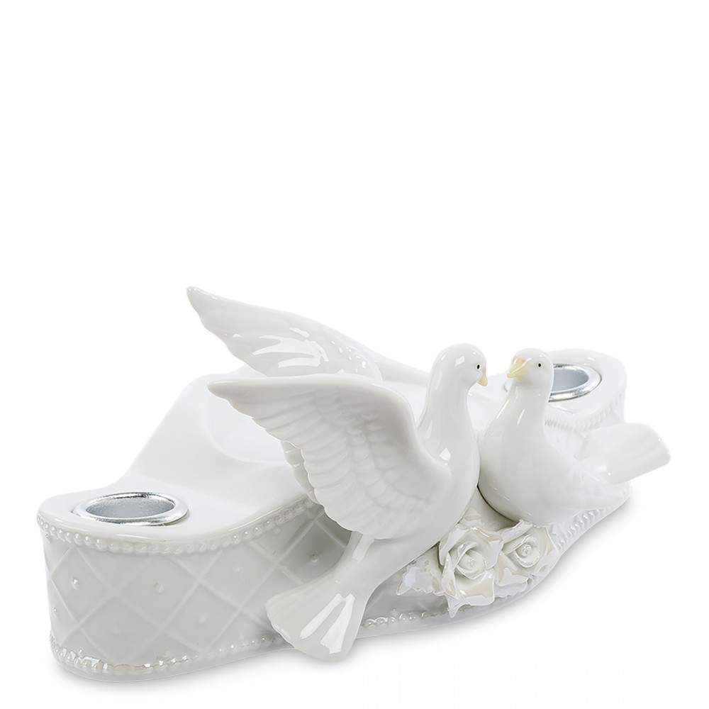 Очень символический подсвечник. В нем можно установить три свечи – две тоненьких и одну толстую. Похоже, это можно расшифровать как две души, которые, слившись воедино, дают начало новому и очень сильному чувству – любви. Оформление подсвечника тоже говорит о любви: на двух цветках розы уселась влюбленная пара голубей. Голубь воркует, распустив свои крылья, объясняется со своей голубкой, а та буквально глаз с него не сводит. Подарок такой – это или знак любви, обещание романтических отношений, или их пожелание, если его дарят друзья влюбленной паре или молодоженам.