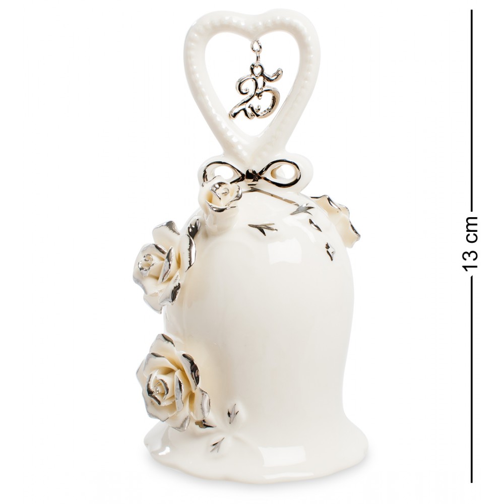 Со дня бракосочетания миновало уже четверть века. 25 лет – серебряная свадьба, благодатное время зрелости, когда дети уже выросли, а старость еще вдалеке. Под легкий звон этого фарфорового колокольчика хорошо вспомнить прожитое и настроиться на будущее – до золотой свадьбы осталось еще четверть века. Колокольчик украсит интерьер комнаты, по его нежному, светло-бежевому фону расположились слегка позолоченные цветы. Этот подарок не к шумному торжеству: просто позади осталась первая половина жизни. И если вдруг станет грустно, позвоните в колокольчик: жить тотчас же станет веселее!