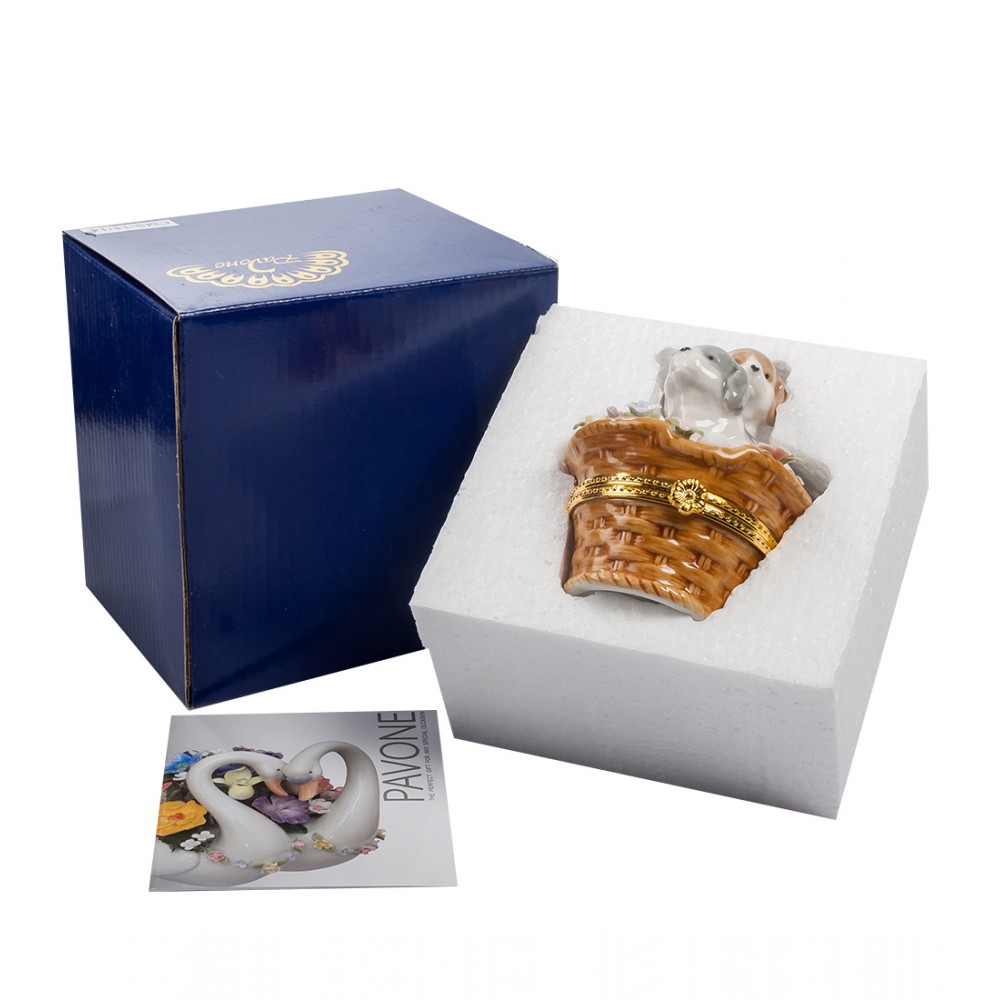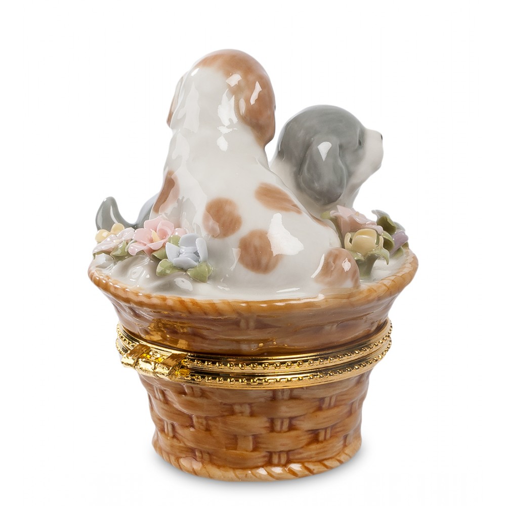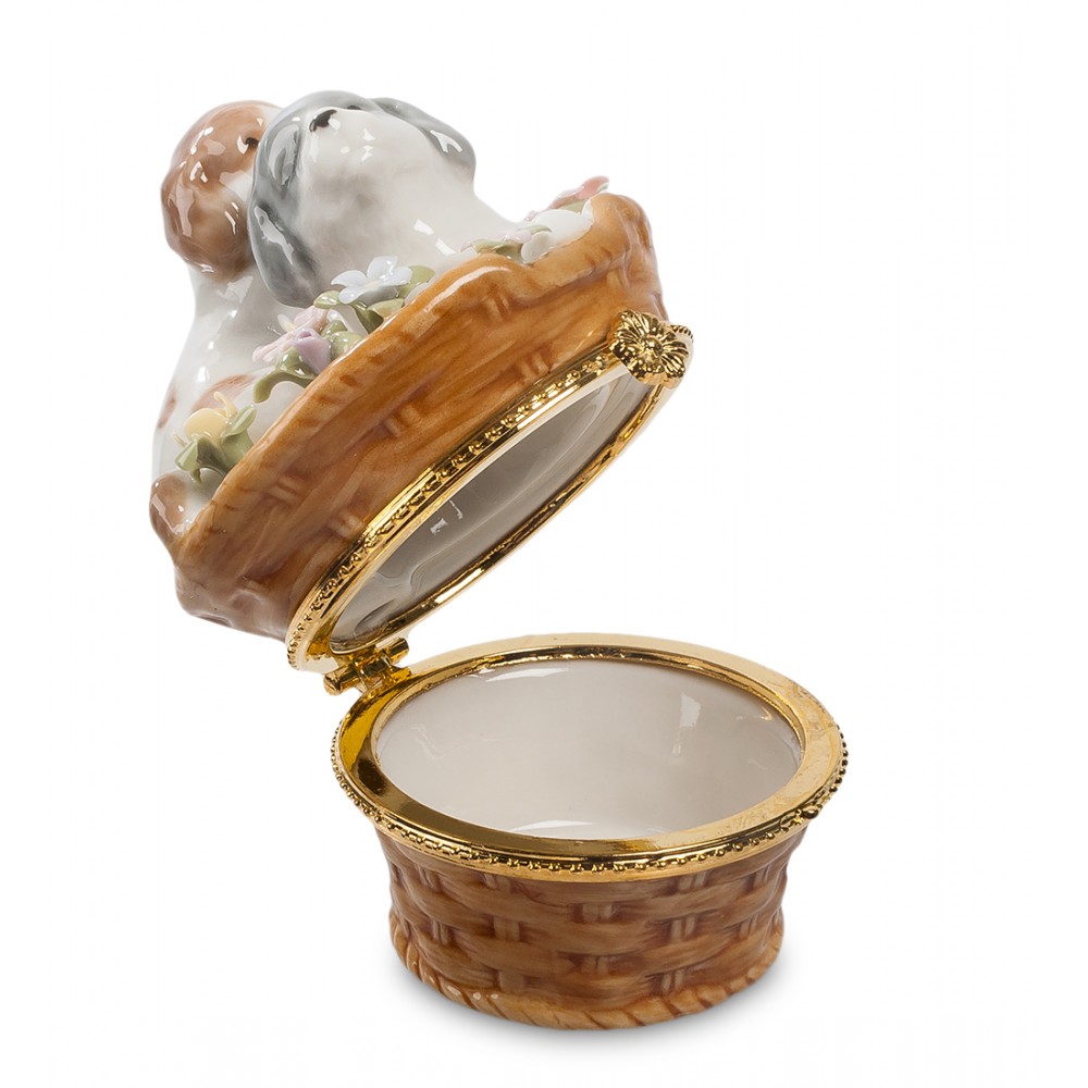 Простая сельская сценка. В плетеной корзинке устроились два симпатичных щеночка, которых кто-то осыпал сверху яркими разнообразными цветами. Композиция может украсить собой, например, туалетный столик, тем более, что она имеет определенный секрет. Посередине корзина охвачена двумя золотистыми обручами, по границе между которыми она может открываться, показывая свободное пространство внутри. Так что это – не просто фигурка, а шкатулочка. В ней удобно держать те украшения, которые необходимы ежедневно. Их надевают перед выходом из дома и снимают вечером. Теперь они будут храниться в полном порядке и находиться всегда под рукой.