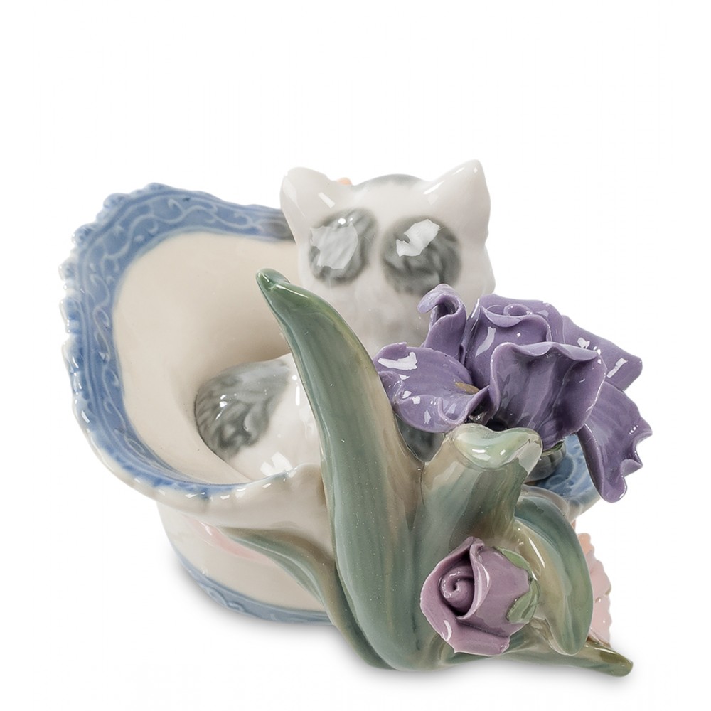 Милый белый котенок в пепельные пятна игриво выглядывает из большой широкополой летней шляпы, создавая атмосферу беззаботности и юности. Ярким цветным акцентом этой композиции по праву можно назвать большой фиолетовый цветок, с причудливо изогнутыми лепестками, на заднем плане. Все это фарфоровое великолепие настолько динамично, что будто вот-вот оживет и маленький котик, наконец, совершит решающий прыжок в погоне за бабочкой.