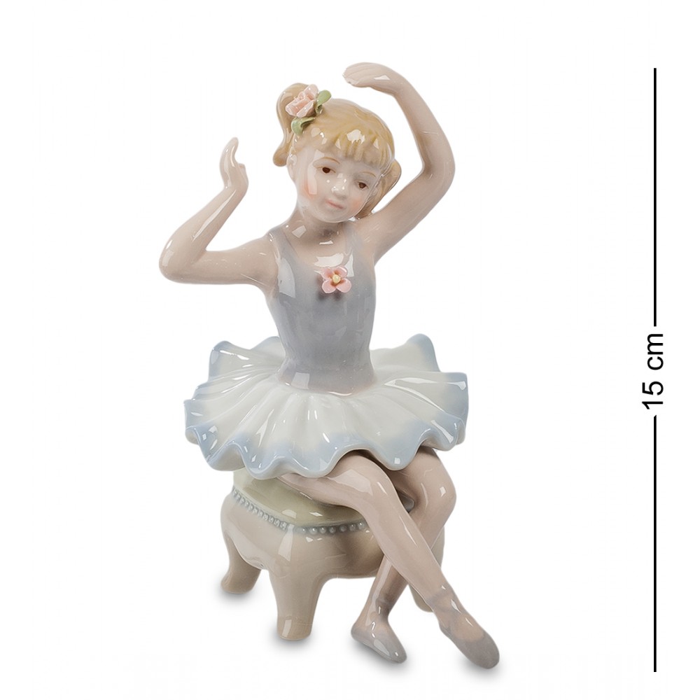 Маленькая девочка – настоящая балерина. Пусть недолго занимается она этим прекрасным искусством, но на ней уже настоящее балетное платье и она явно готовится к выступлению на сцене – может быть, к самому первому в своей жизни. Девочка на минутку присела и протянула руки к своей прическе – как там держится красивая роза, украшающая ее волосы? На груди у девочки – еще один цветок, оживляющий строгую балетную одежду. Подарить такую фигурку можно такой вот юной балерине с пожеланием стать знаменитой, но не забывать и то время, когда она делала в мире танца первые шаги.
