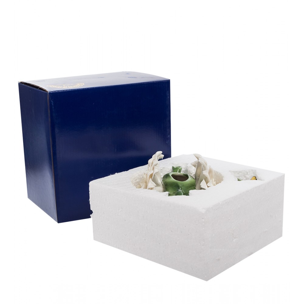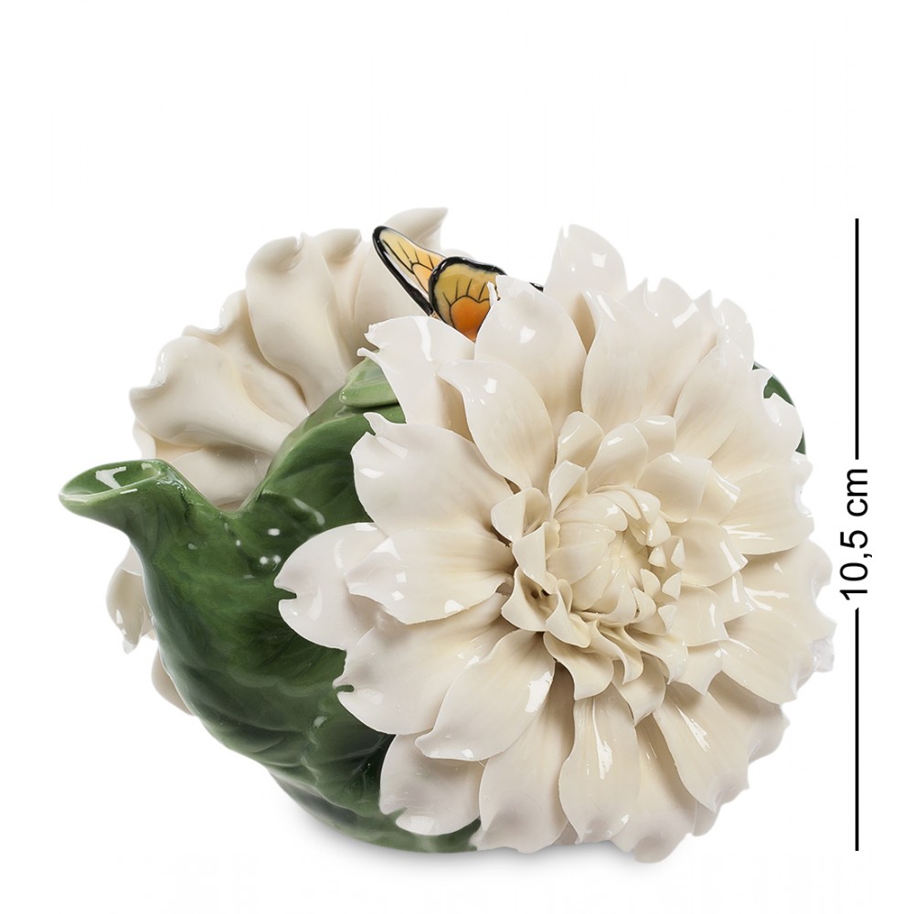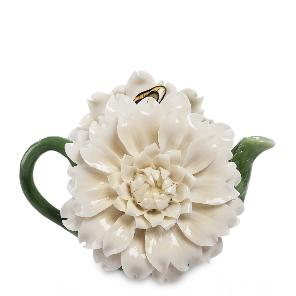 Этот заварочный чайник как будто решил спрятаться между роскошных цветов. Две белые хризантемы прикрыли его корпус так, что из-за них видны только носик и ручка, выкрашенные в зеленый цвет, как цветочные стебли. Да вверху между цветами присела на крышку чайника золотистая бабочка, которая имеет особое назначение – взявшись за нее, можно открыть крышку и загрузить в чайник порцию чая. Похоже, даже обычный чай приобретет аромат цветов, если его заварить и разлить по чашкам из этого чайника. А о том, что чайник украсит собой стол, за которым происходит чаепитие, и говорить не стоит. Просто, в лучшем стиле китайских традиций, к вкусу и аромату чая добавится еще и красота цветов!