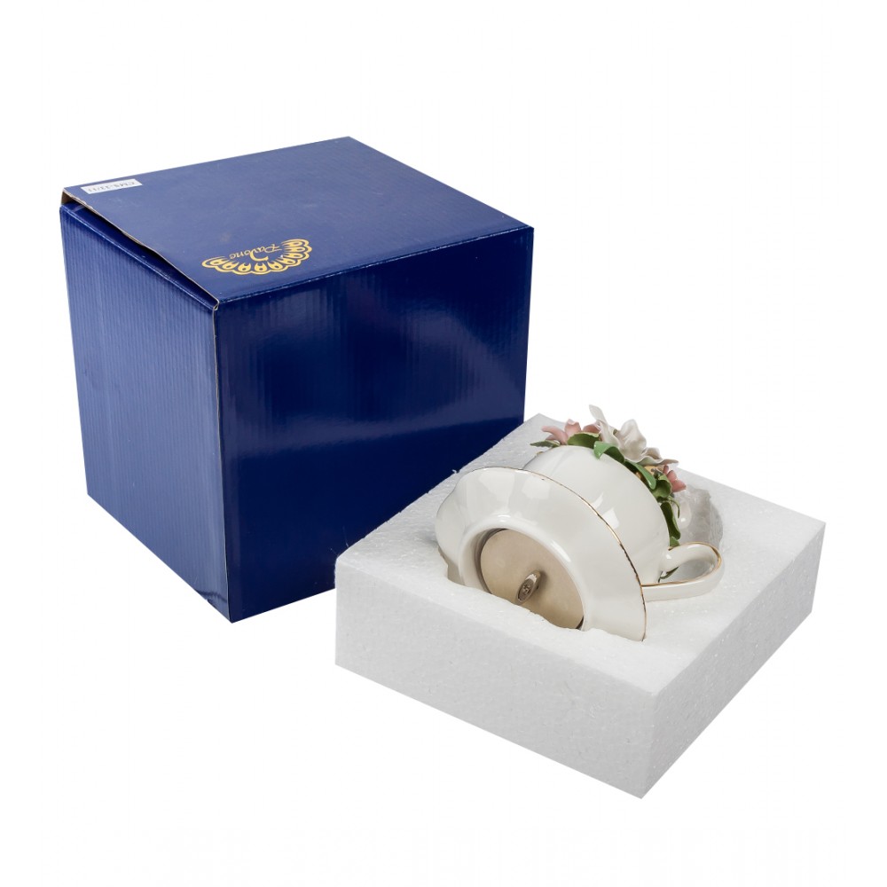 Из этой красивой чашки с позолоченными краями чаю не напиться. Все место внутри чайки занято цветами. Не верится, что эти разноцветные лепестки выполнены из фарфора – настолько они тонкие и яркие, как будто живые. Так что место для этой чашки с блюдечком и цветами – не на обеденном столе, а на полке с сувенирами. Такой своеобразный букет будет радовать круглый год, эти цветы не завянут никогда, каждый день и при любой погоде поднимая настроение. На день рождения любой женщине можно подарить букет живых цветов и такой вот букетик в чашке – на память. Один букет дополнит другой.