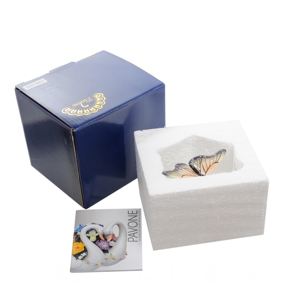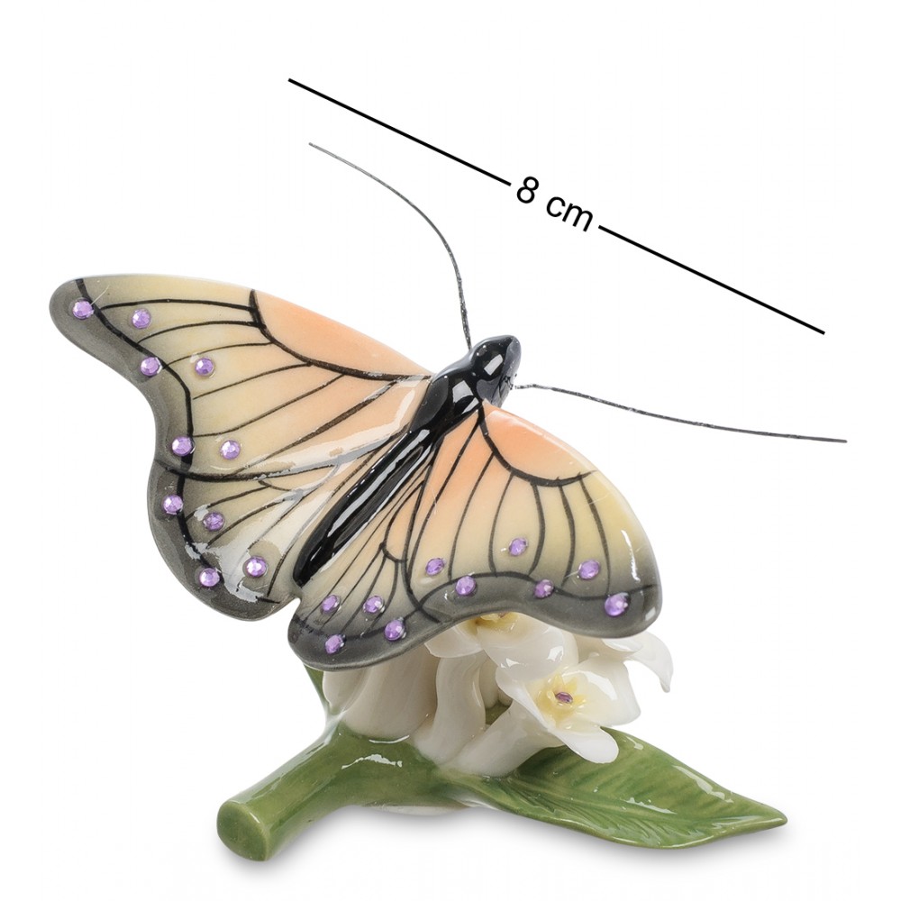 Композиция « Бабочка на цветах » , входящая в коллекцию торговой марки Pavone, является фарфоровым воплощением красоты живой природы. Изделие выполнено в виде миниатюрной бабочки, которая сидит на нежном цветочном бутоне. Крылья фарфоровой бабочки разукрашены настолько выразительно и искусно, что кажется, будто бы через мгновение насекомое взмахнет ими и улетит в поисках новых цветочных бутонов. Изделие расписано яркими акриловыми красками и украшено россыпью миниатюрных стразов, что придает его дизайну особую утонченность и выразительность.
