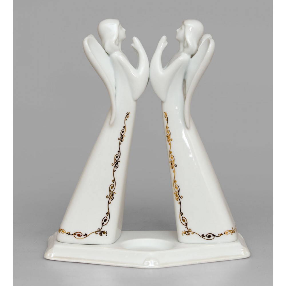 Два белых ангела в длинных узорчатых одеждах вместе молятся, поднявшись друг к другу лицом и сложив в молитвенном жесте собственные руки. Красивые крылья за спинами спокойно сложены – никуда не нужно торопиться. Перед фигурками ангелов на подставке небольшое углубление: это действительно – подсвечник и когда в этом углублении стоит зажженная свеча, кажется, что ангелы молятся, смотря на мерцающее пламя свечки. Для романтичного ужина свеча – идеальное освещение, а если ее еще и обрамляют ангелы, то можно рассчитывать, что встреча окончится взаимным объяснением, а подсвечник с ангелами станет дорогим семейным талисманом. И эти крылатые сущности будут оберегать покой будущей семьи.