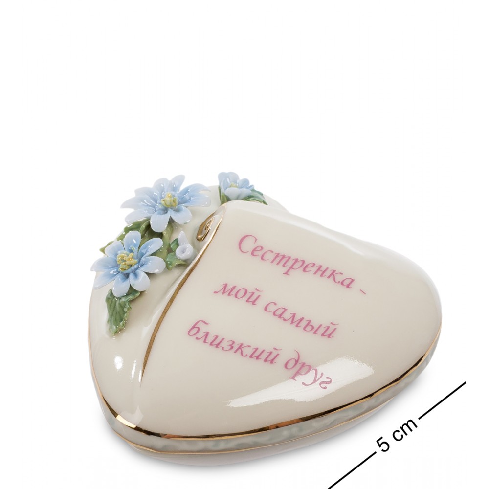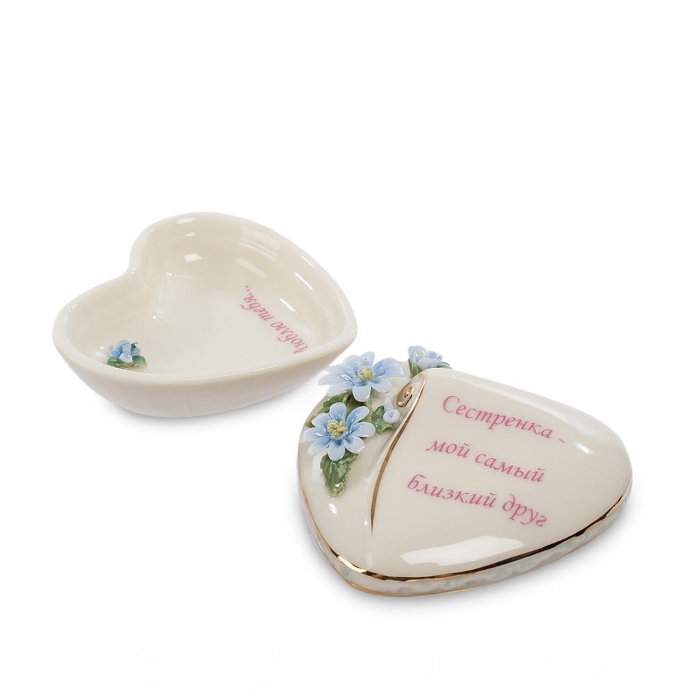 Шкатулка "Сестре" (Pavone) ; Что подарить на день рождения любимой сестричке старшей или младшей – все равно? Вот такое напоминание о своей любви – небольшую шкатулку в виде сердечка. На крышке нежные цветы и свернутый в свиток лист бумаги с дарственной надписью. И внутри тоже пара слов о любви.