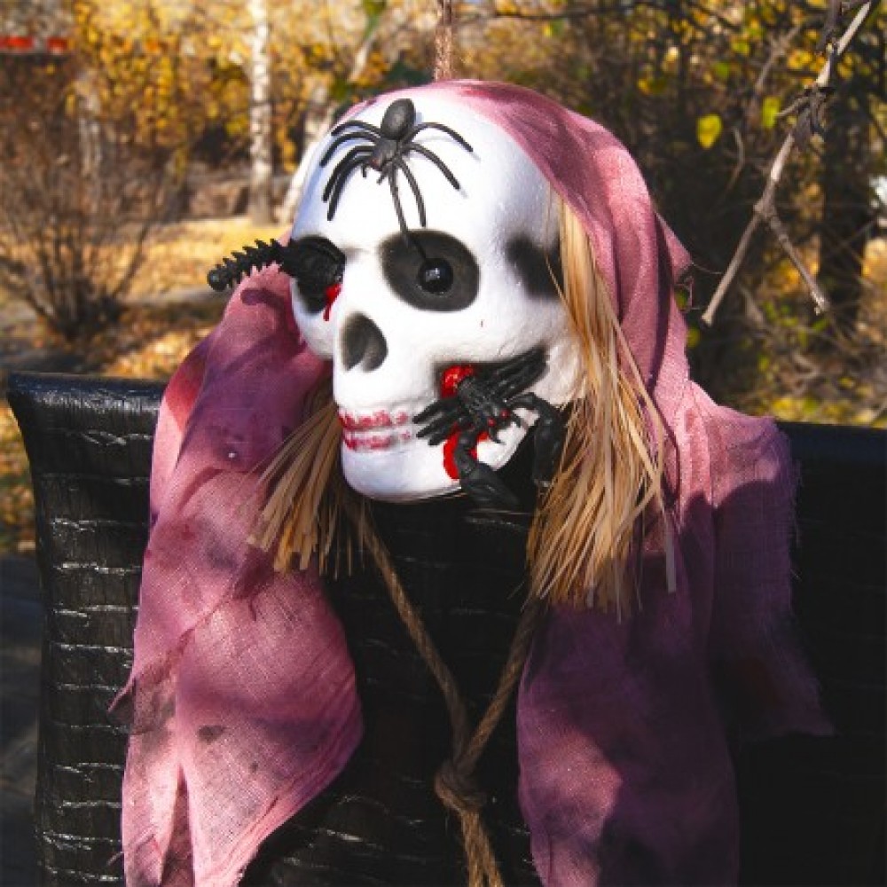 Декор для хеллоуїну Смерть (130см) чорний з рожевим 11676 - прикраса на Хеллоуїн із серії підвісного декору з петелькою для підвішування на вечірку в стилі Santa Muerte або Хеллоуїн. Примарний череп виготовлений з якісного матеріалу, який не розсипається, пінополістиролу, балахон-штучний трикотаж, косинка-сатин. Особливого шарму висячої смерті надають поєднання шпагату на шиї з черепами. Червоні кристали в очах ефектно переливаються і створюють враження очей, що горять при попаданні на них світла. Ідеально підходить для прикраси арт-простір клубу, фото зони на Хеллоуїн. Вражаюче підвісний декор виглядає у клубах при освітленні флюоресцентними лампами – білий колір черепів світиться. Просто повісьте на двері чи стіну, щоби здивувати ваших гостей під час свята Дня всіх мертвих. Рекомендуємо до цього готичного підвісного черепа ще павутиння, яке допоможе Вам відтворити містичну атмосферу. Інтернет-магазин Подарок-тут! пропонує купити висячі прикраси для дому з привидами за найкращими цінами в Україні.