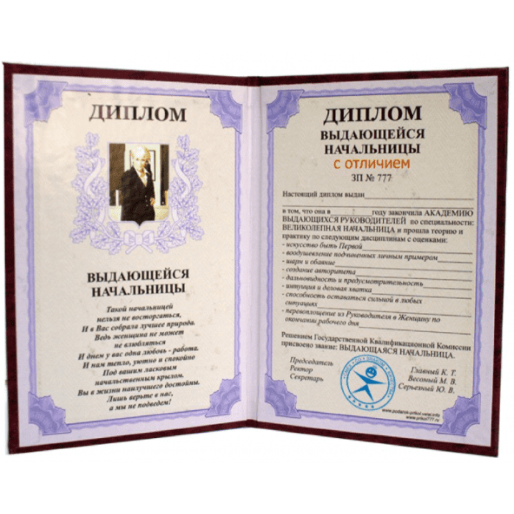 Диплом "Выдающейся начальницы" (рус) PT-DIP155