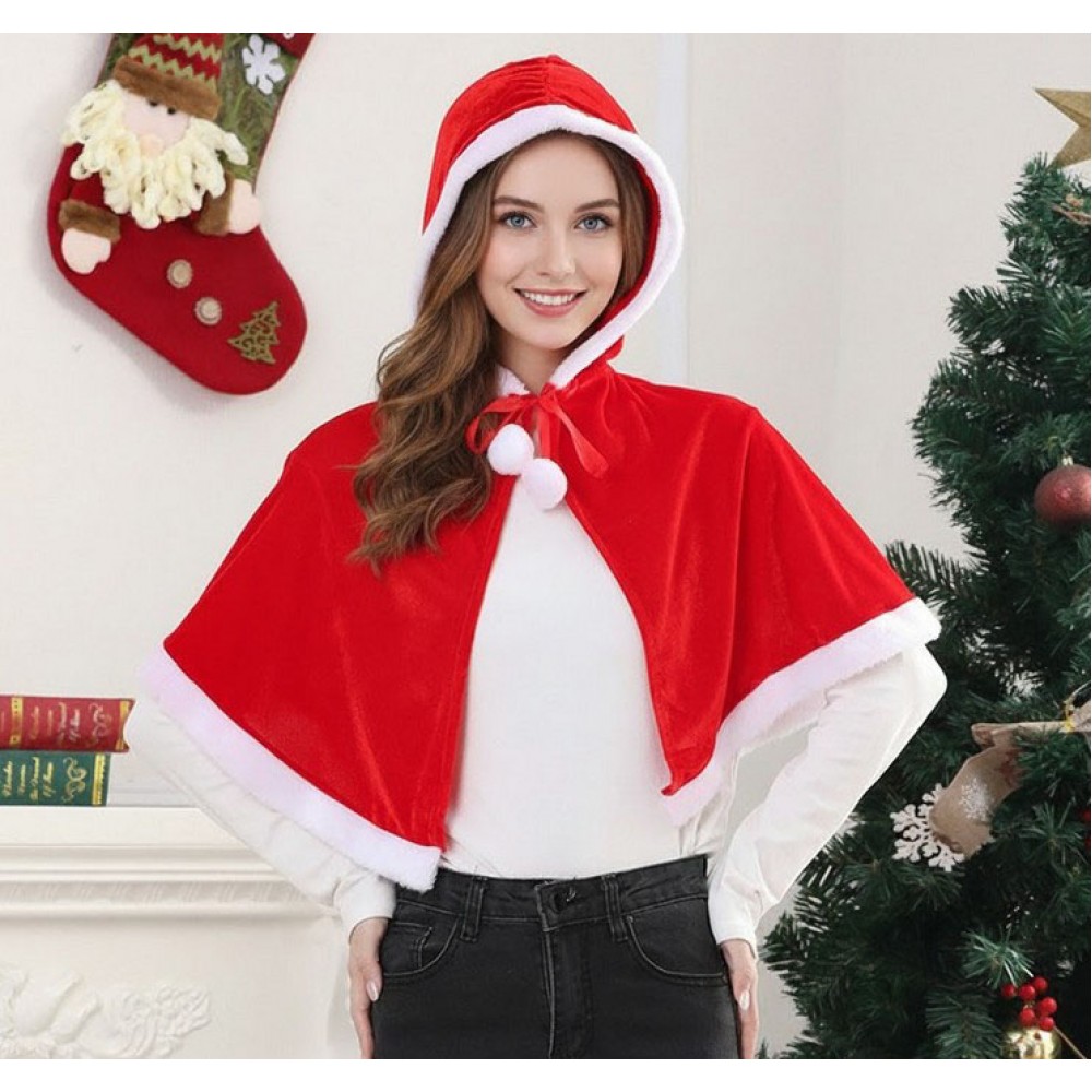 Оксамитова різдвяна пелерина з капюшоном використовується як елемент святкового костюма на Новий рік і Різдво. Підходить для фотосесій, корпоративних вечірок, домашніх свят, сценічних номерів і тематичних заходів, де потрібен акуратний і впізнаваний новорічний акцент в одязі.