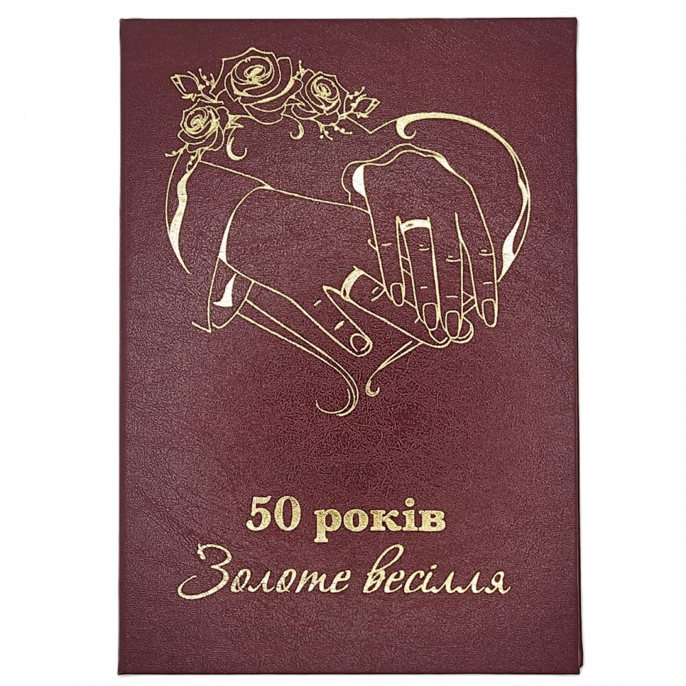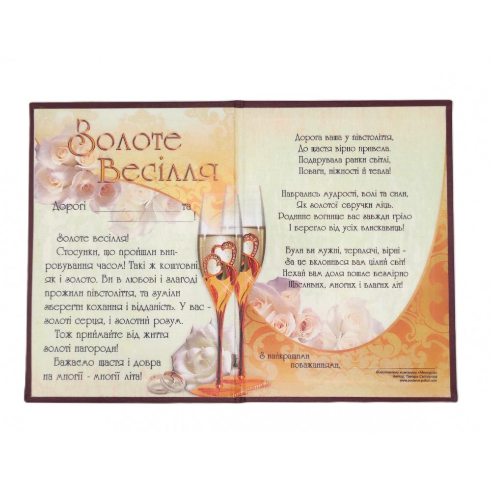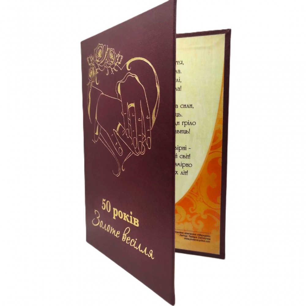 Диплом "Золоте весілля" 50 років. У середині диплома побажання та вірші для дарувальників. Диплом зроблений із щільного картону обтягнутий вінілом із нанесенням золотого тиснення. Обкладинка може бути в іншому кольорі. Диплом має розмір А5 формату в розкритому форматі.