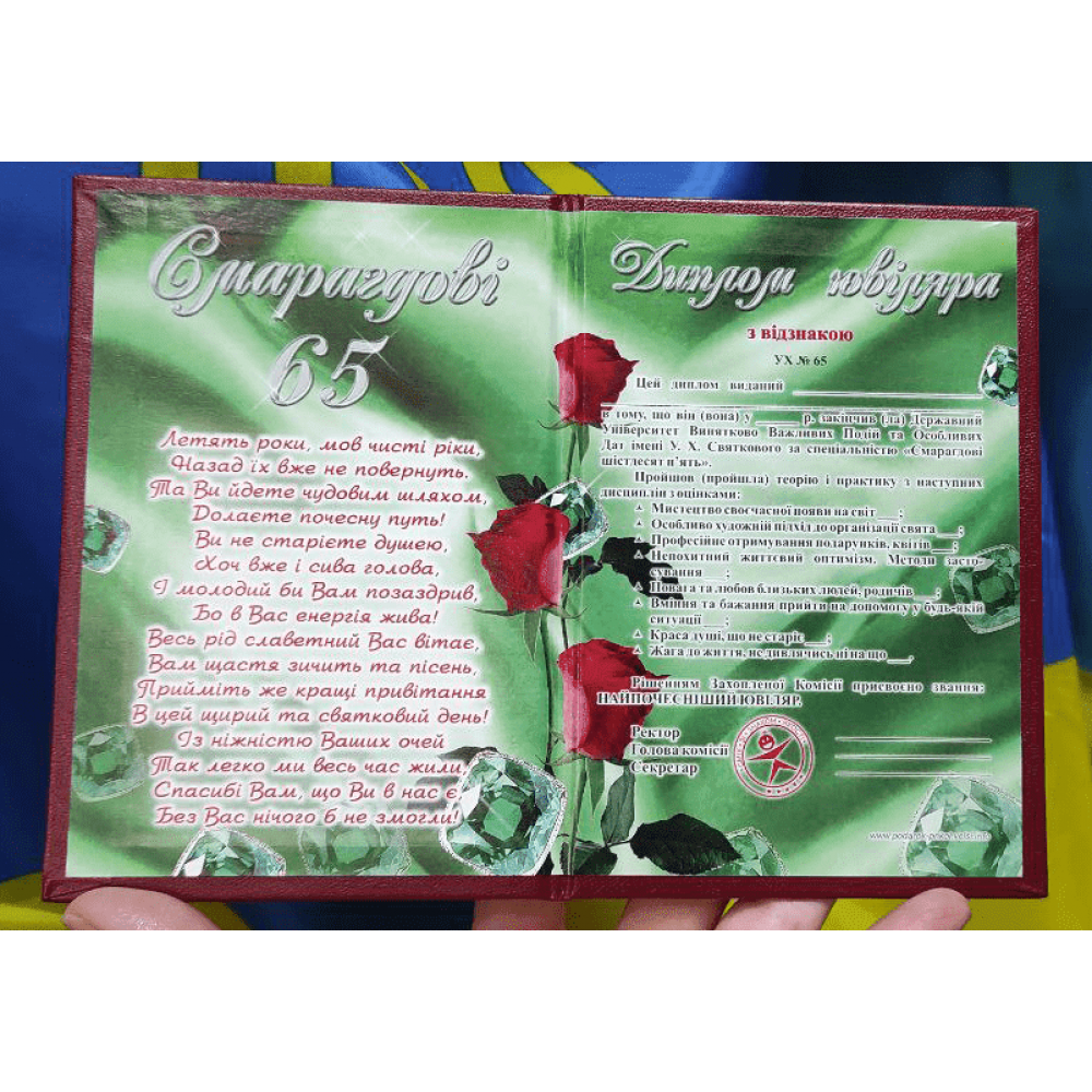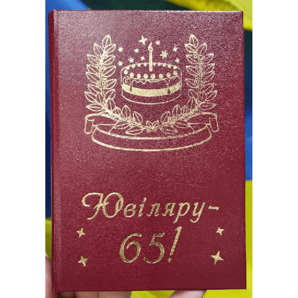 Подарунковий диплом Ювіляру – 65! У середині побажання та вірші для іменинника потрібно лише вписати ім'я винуватця урочистості. Зроблений із щільного картону, обтягнутий вінілом, колір може відрізнятись від картинки. Додаткова інформація: Країна виробництва – Україна; Колір – Червоний, бордовий; Матеріал виробу – Картон обтягнутий вінілом; Розміри виробу – Висота 16 см, ширина 11 см.;