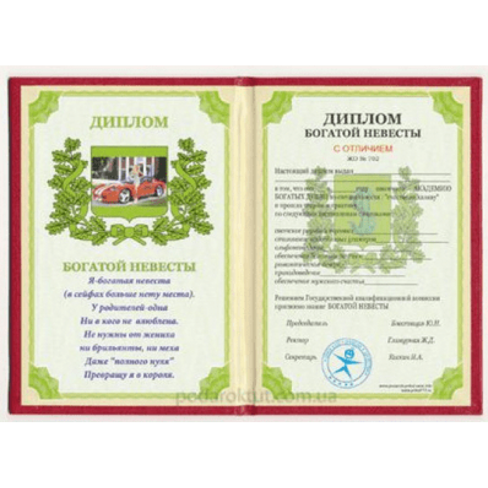 Диплом "Багатої нареченої" Таким дипломом можете привітати свою найкращу подругу, він виконаний у вітальній та жартівливій формі, радість приносять не лише дорогі подарунки.