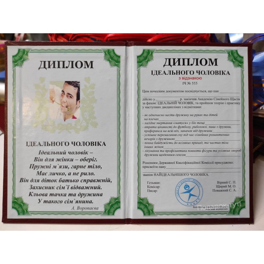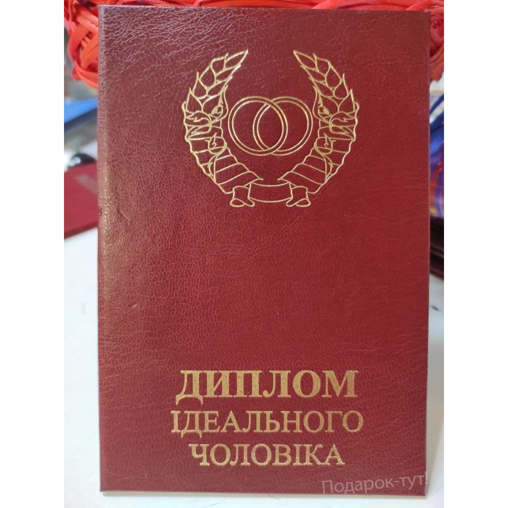 Диплом "Ідеального Чоловіка" диплом українською мовою, подарунки не завжди можуть бути дорогими, цей диплом для чоловіка буде приємним та пам'ятним подарунком. Высота 16 см, ширина 11 см. Диплом зроблений із щільного картону обтягнутий вінілом із золотим тисненням, картинкою. У середині є побажання та рядки для кого призначається диплом.