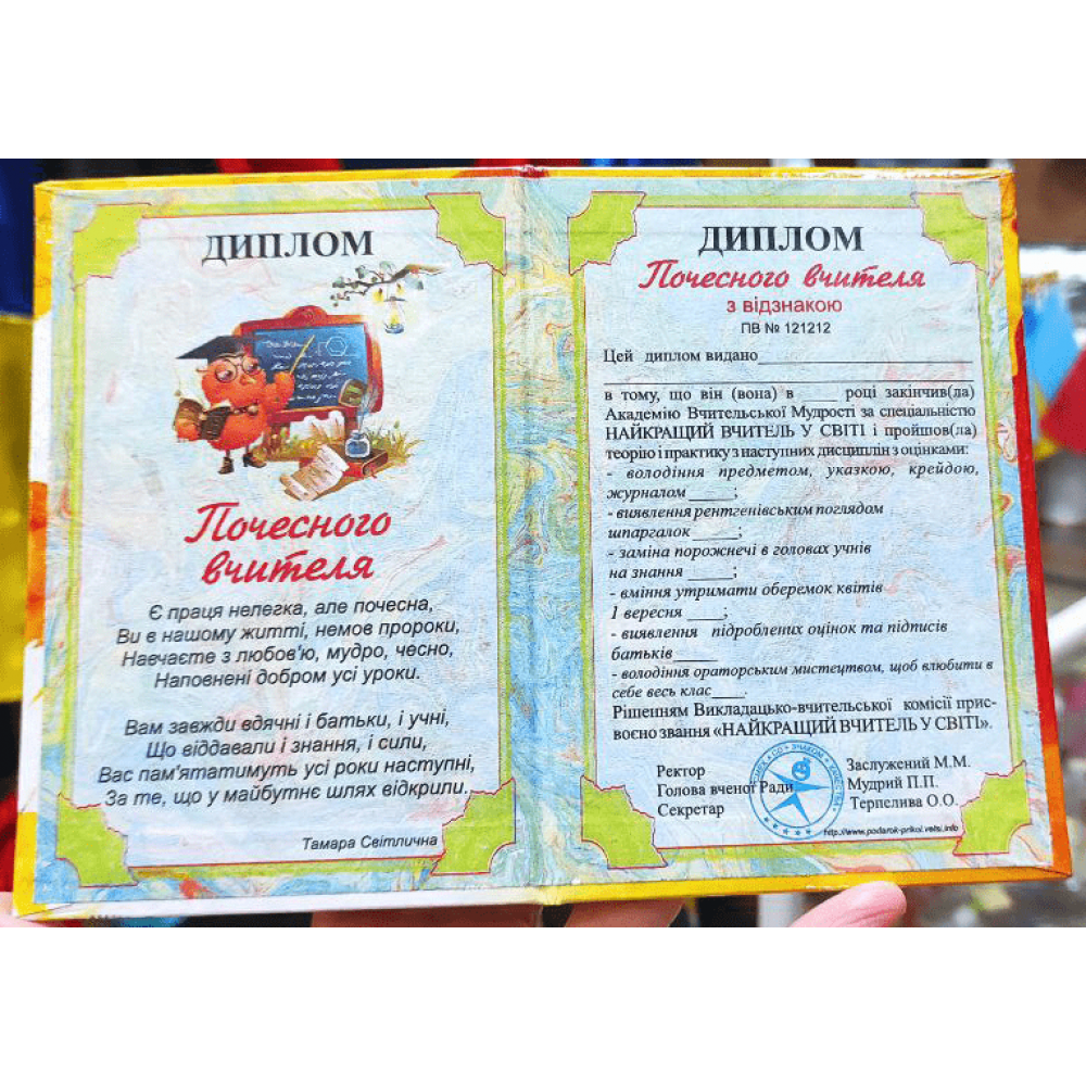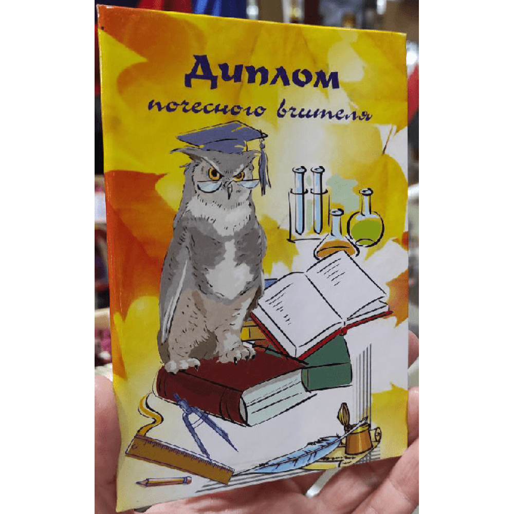 Подарунки не завжди можуть бути дорогими, цей диплом для вчителя буде приємним та пам'ятним подарунком. Диплом зроблений із щільного картону обтягнутий кольоровою ламінованою картинкою. У середині є побажання та рядки для кого призначається диплом.