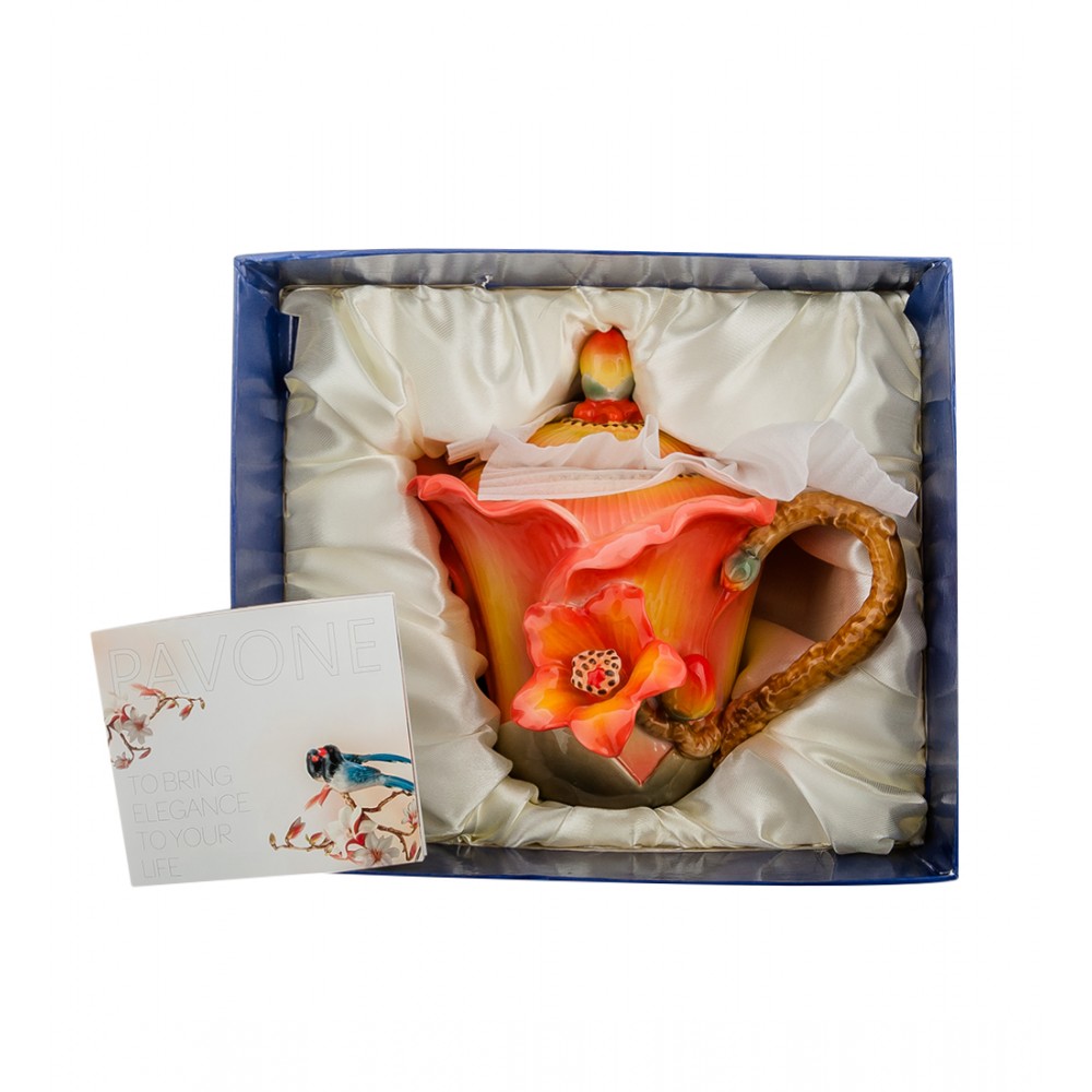 Изделие выполнено в форме нежнейшего бутона, солнечных оттенков, а детализация его элементов поражает. Чего только стоит крышечка, которая в малейших чертах повторяет сердцевинку цветка хлопка, а насколько изящен вид ручки чайника « Капок » , повторяющий изгиб тонкой ветки.