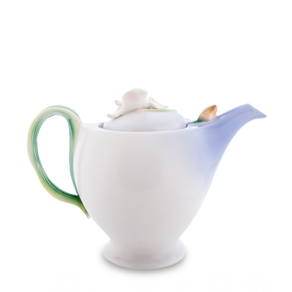 Элегантный заварник « Орхидея » привлекает внимание собственными яркими формами. Нежно-белая орхидея с розовой серединкой сделает красивее любую коллекцию посуды. Плавные линии мягко выделяют дизайн чайника, а голубенький носик заставляет подумать о лавандовом цвете бескрайних полей.