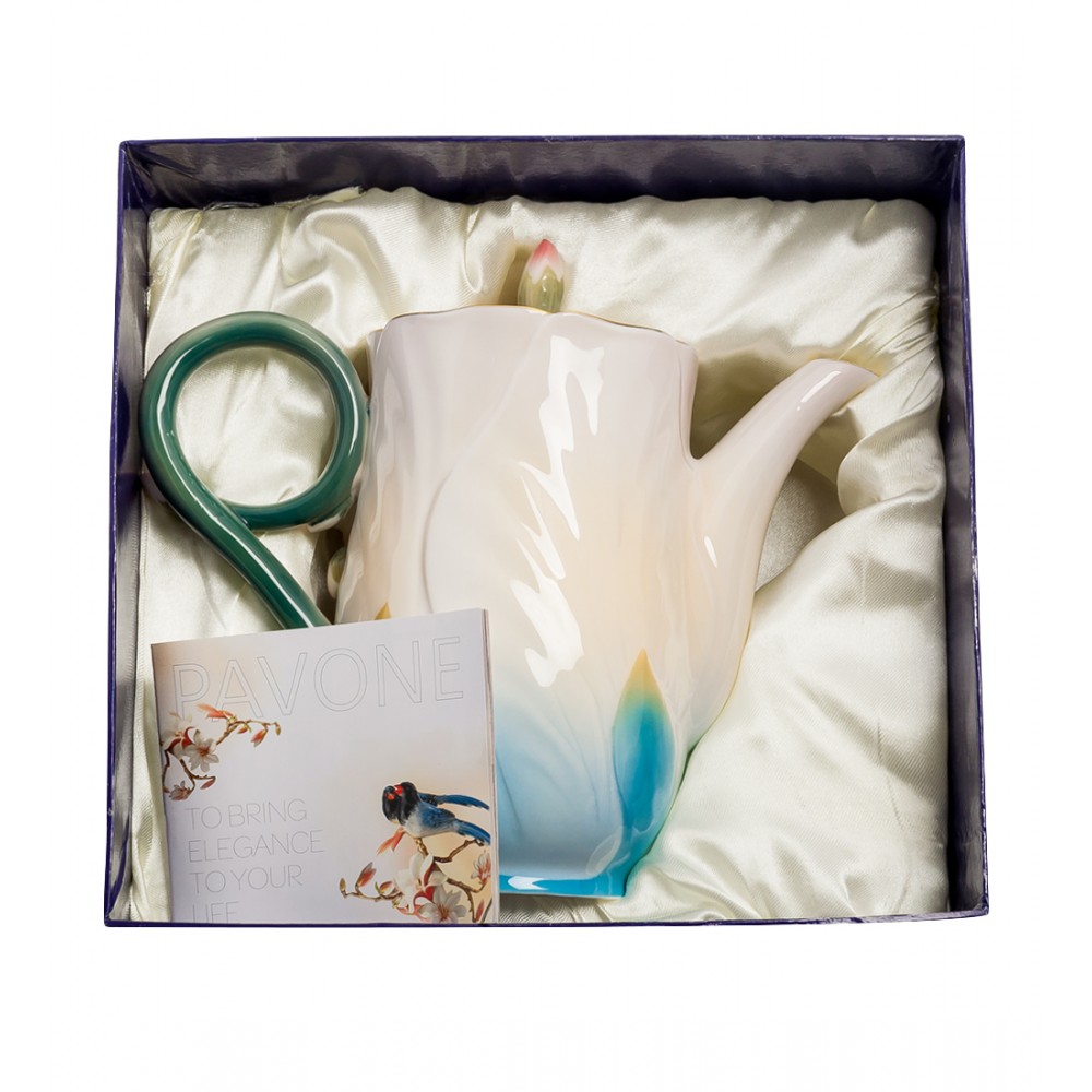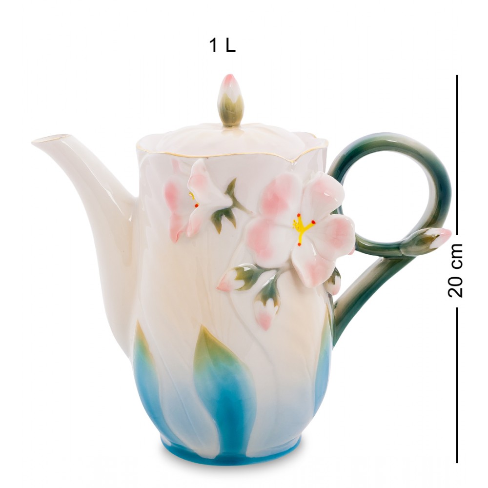 Наверное, такие чайники растут на деревьях. Ручка как необыкновенный побег делает петлю и завершается бутоном. На крышечке – тоже бутон. А на самой поверхности чайника, как на странном стволе, открылись цветы розового цвета герани. Не удержались в границах поверхности, выпустили розовые лепесточки в пространство вокруг. И сам чайник напоминает необыкновенный цветок, который распустился на вашем столе, привнося праздничную атмосферу.
