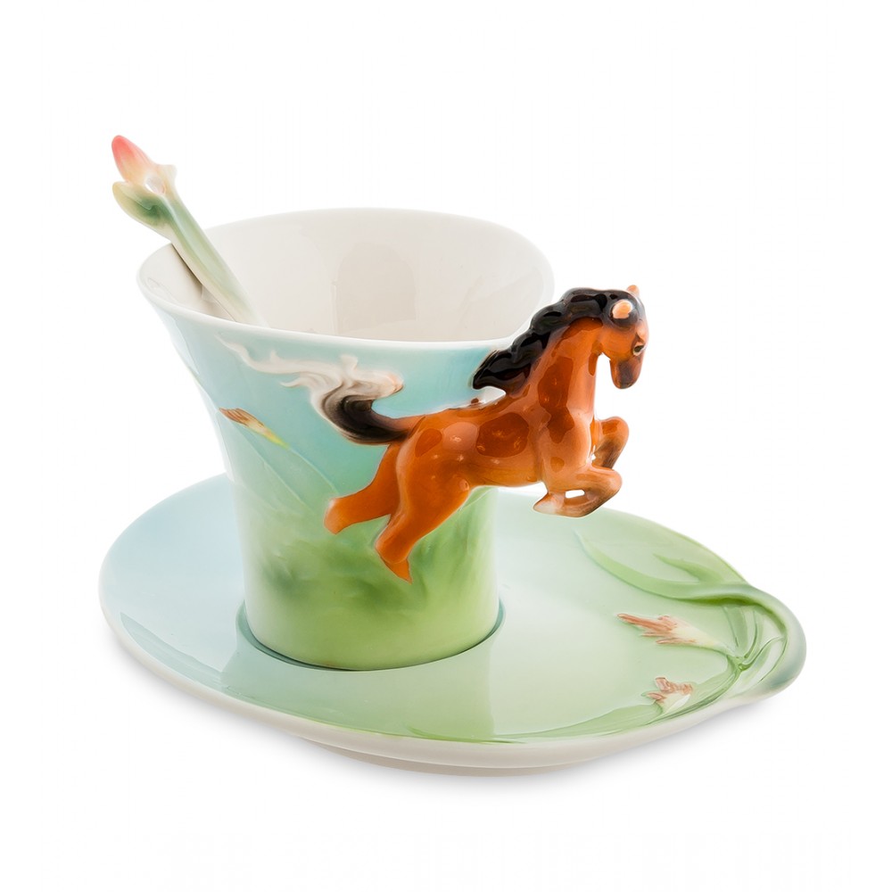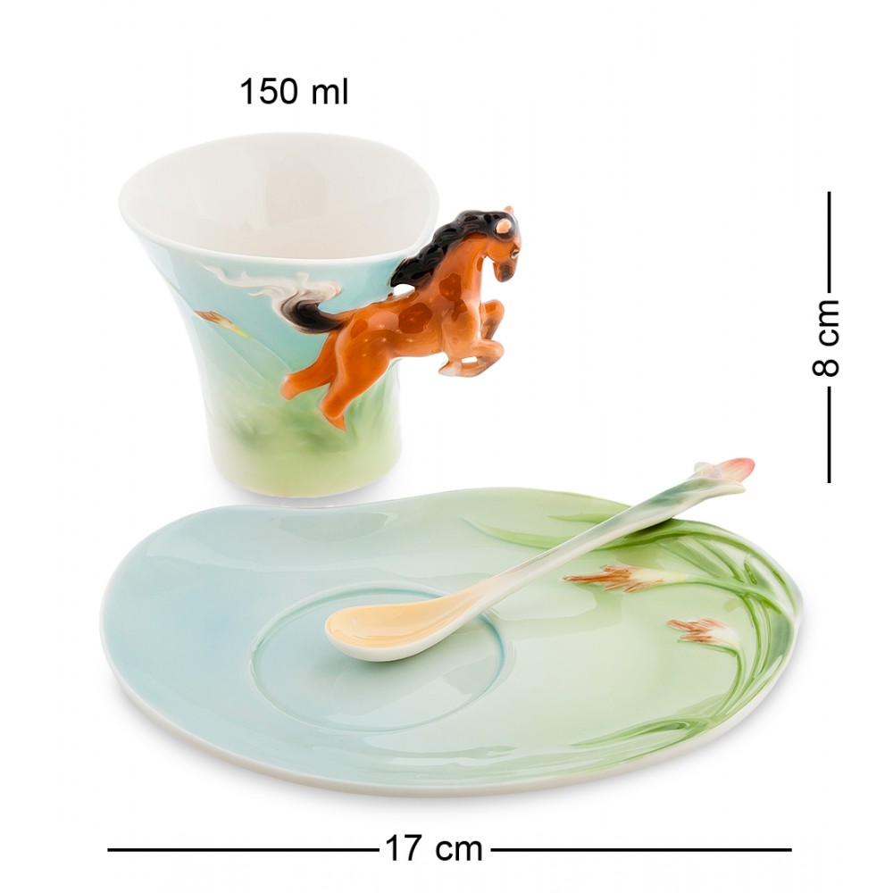Гнедой скакун будто желает выпрыгнуть из этой композиции на зеленый луг, простирающийся на блюдце. Поразительная фигурка лошади, очень утонченно созданная художниками и дизайнерами, делает эту пару для чаепития абсолютно необыкновенной.