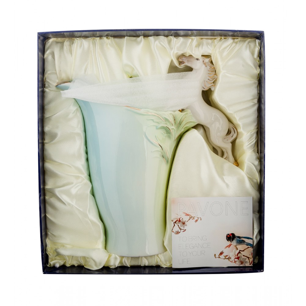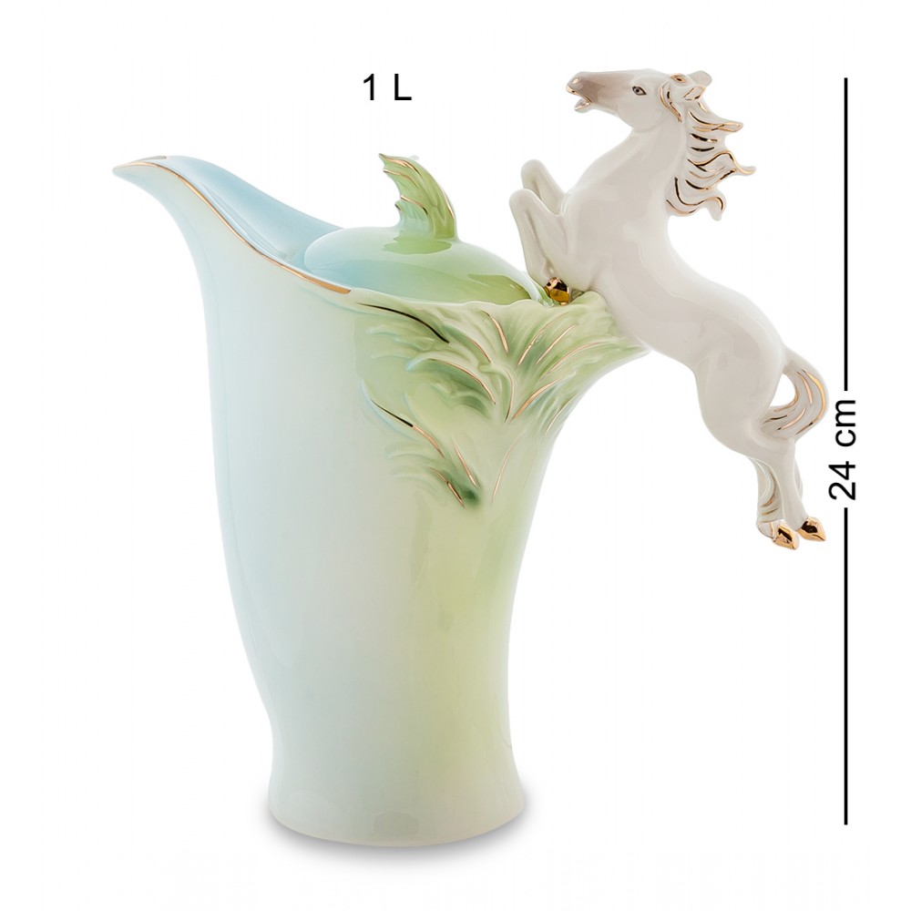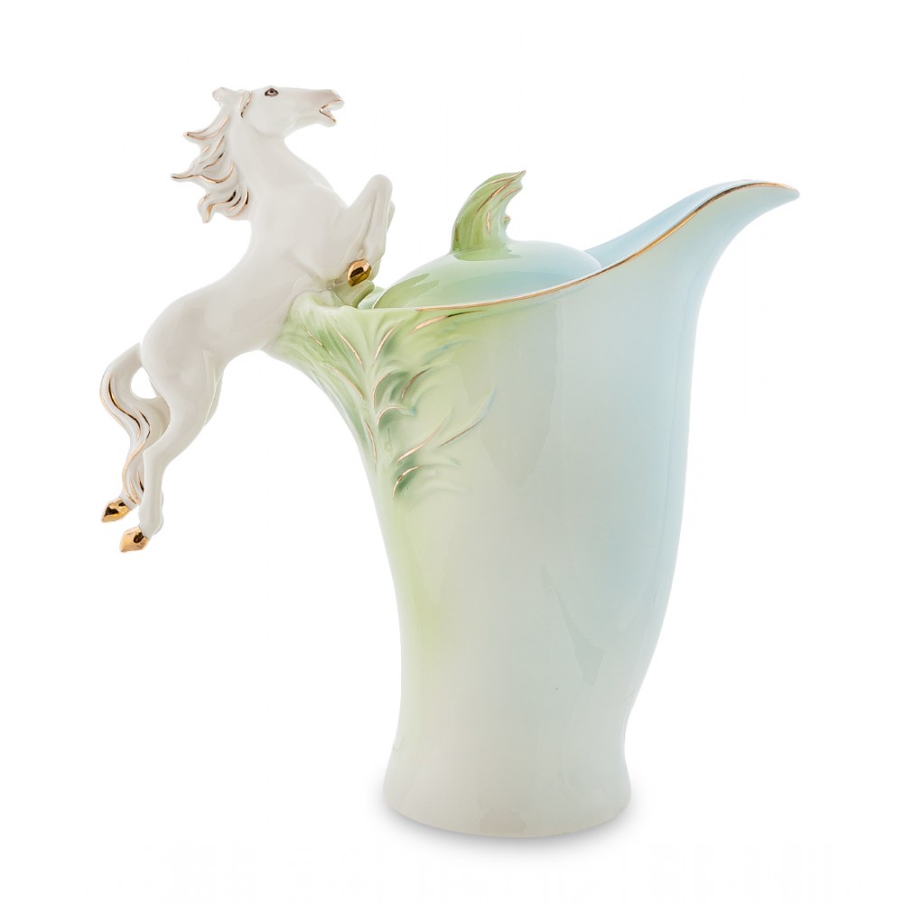 Грациозность этой лошадки не знает границ. Настолько красивые формы чайника способны сделать только умельцы в Павоне. Резное величие, коим украшен верх чайника, и восхитительный наконечник на его крышке вызывают искреннее восхищение. Нежность зелёного цвета, неприметно и медленно перетекающего в великолепной чистоты белый, не даёт покупателю отвести очарованного взора от этого произведения художественного искусства ни на одно миг.