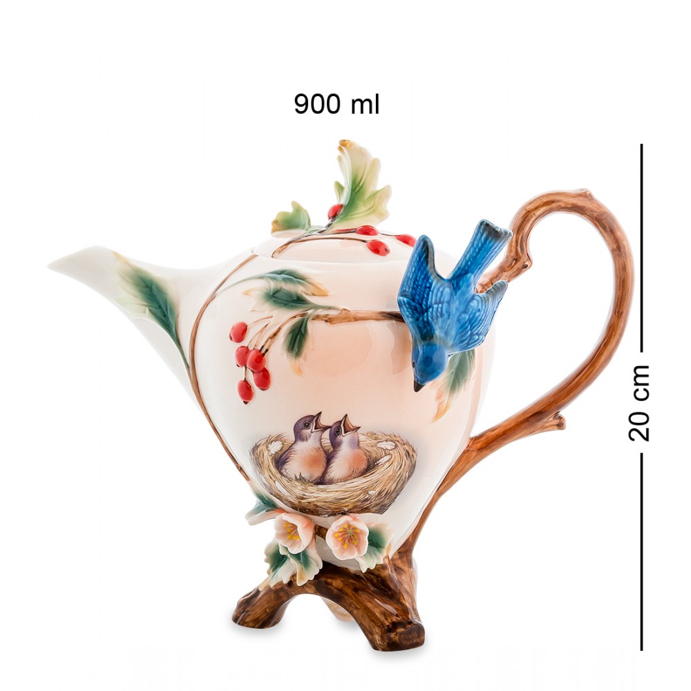 Оригинальный и яркий заварник « Голубые птицы » напоминает картину настоящей природы, где птичка прилетает покормить собственных птенцов. Яркость красок настолько реально передана авторами, что картину тяжело отличить от настоящей природы. Блеск фарфора делает общий пейзаж еще более правдоподобным и романтичным.