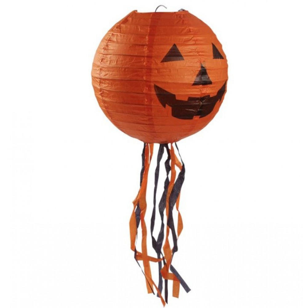 Підвісний ліхтар-лампіон «Гарбуз» — швидкий спосіб оформити простір до Хелловіну. Помаранчева куля діаметром 30 см з класичною усмішкою «Джека» та довгими чорно-помаранчевими стрічками помітна здалеку, красиво коливається від протягу і ефектно виглядає в кадрі. Декор легкий: розгорніть каркас, закріпіть паперовий абажур, повісьте за петлю — і готово. Інструменти не потрібні.