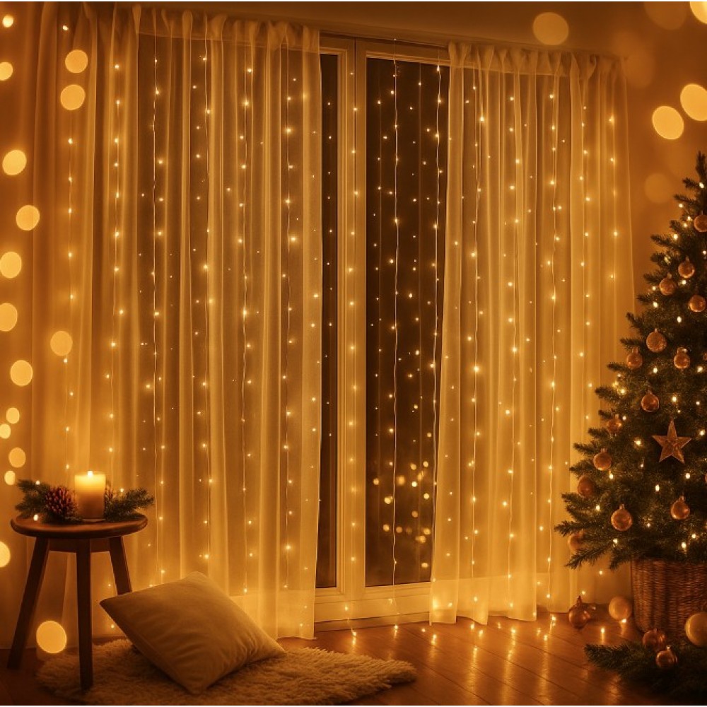Жива «світлова водоспадна» штора для вікон, стін і фотозон. 300 теплих діодів створюють м'яке затишне світло, яке відразу робить кімнату теплішою і «дорожчою» на вигляд. Формат 3×3 м закриває великий проріз одним увімкненням — ідеальний варіант на свята, у спальню, кафе, вітрину або для контент-зйомки.