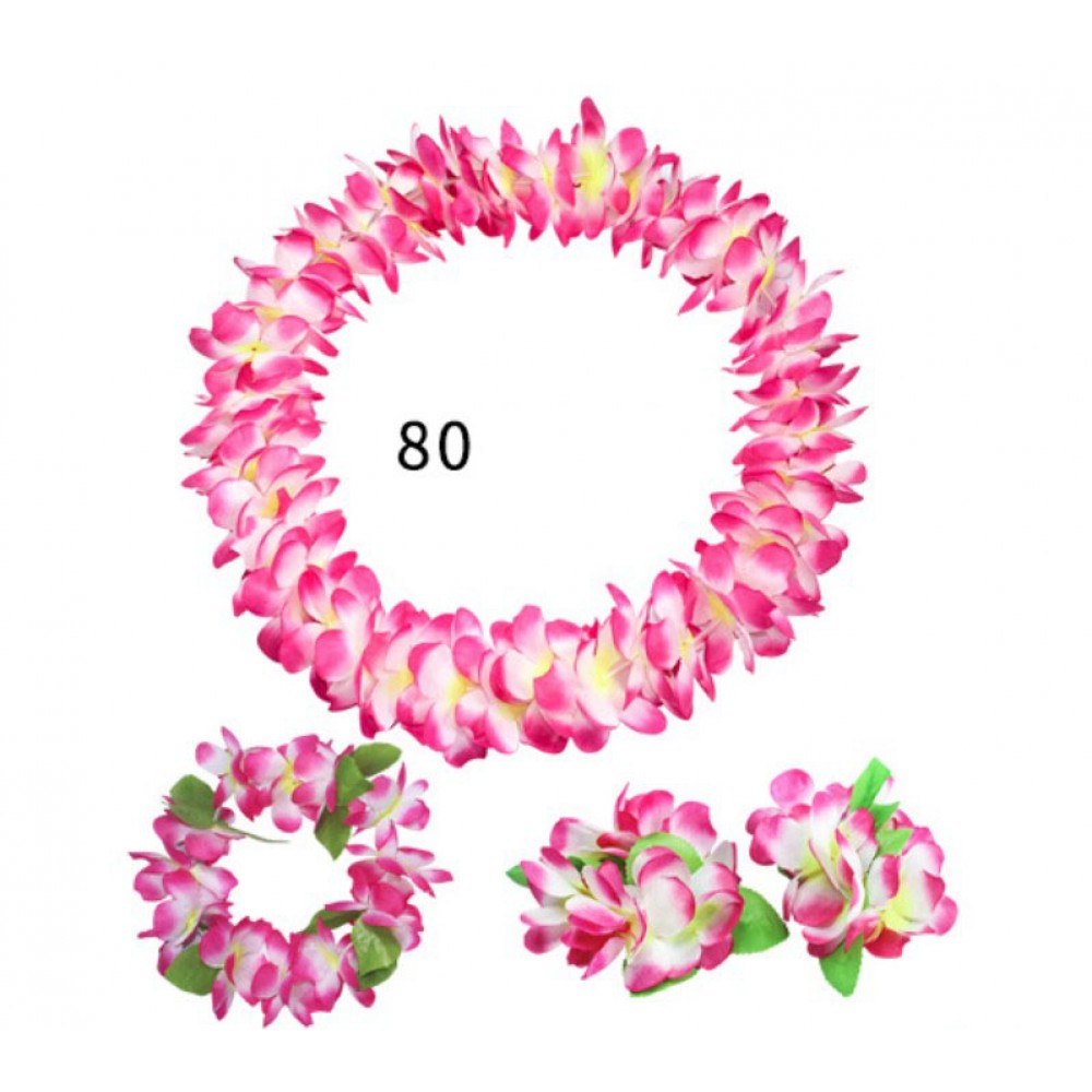Шукаєш яскравий і помітний аксесуар для вечірки в гавайському стилі? Ось він — пишний набір гавайських леїв з 80 пелюстків! Соковиті рожево-білі квіти з легким жовтим акцентом виглядають максимально святково і відразу створюють потрібний настрій. Леи об'ємні, щільно зібрані, виглядають дорого і ефектно як на фото, так і вживу.