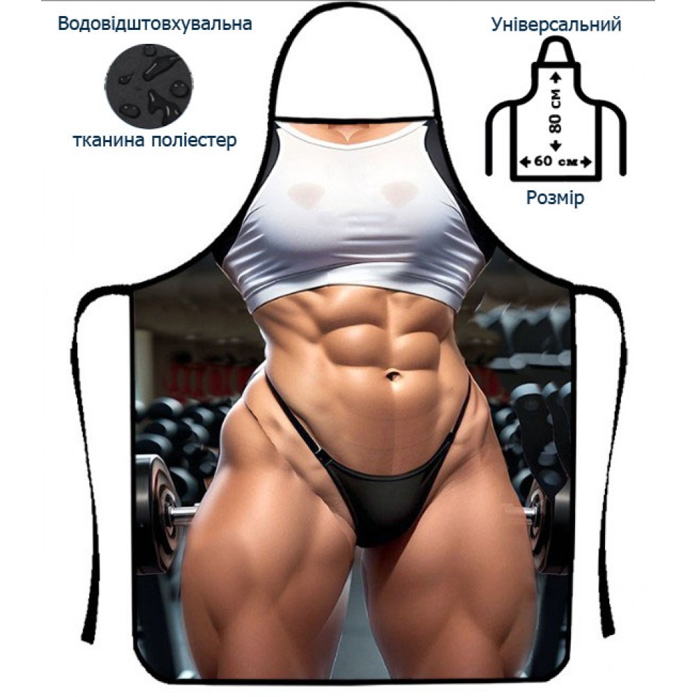 Подивіться на цей шедевр - рельєфне тіло справжньої амазонки, м'язи, від яких не відірвати очей, і осанка королеви фітнесу! Цей оригінальний фартук показує, що можна бути і спортивною, і жіночною одночасно. А готувати так, щоб навіть протеїновий коктейль здавався десертом!