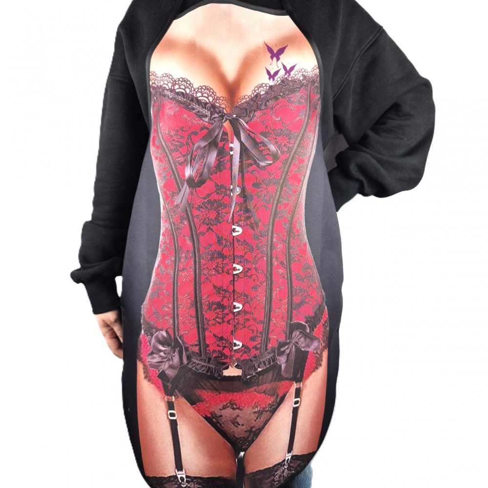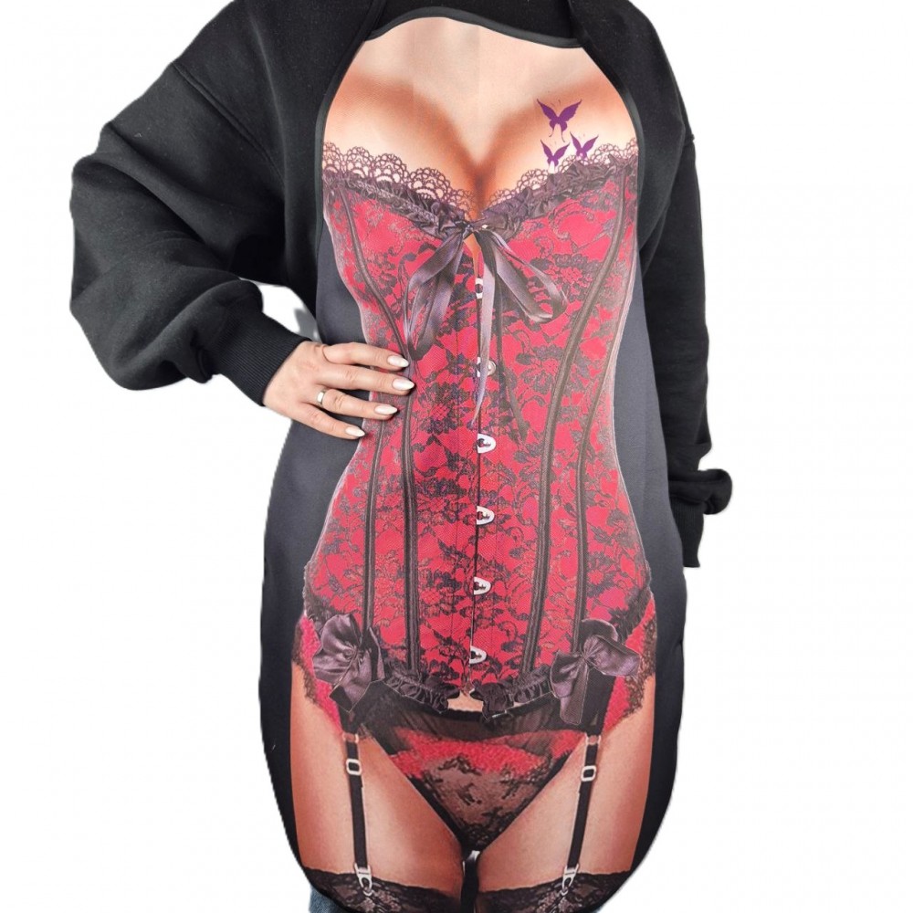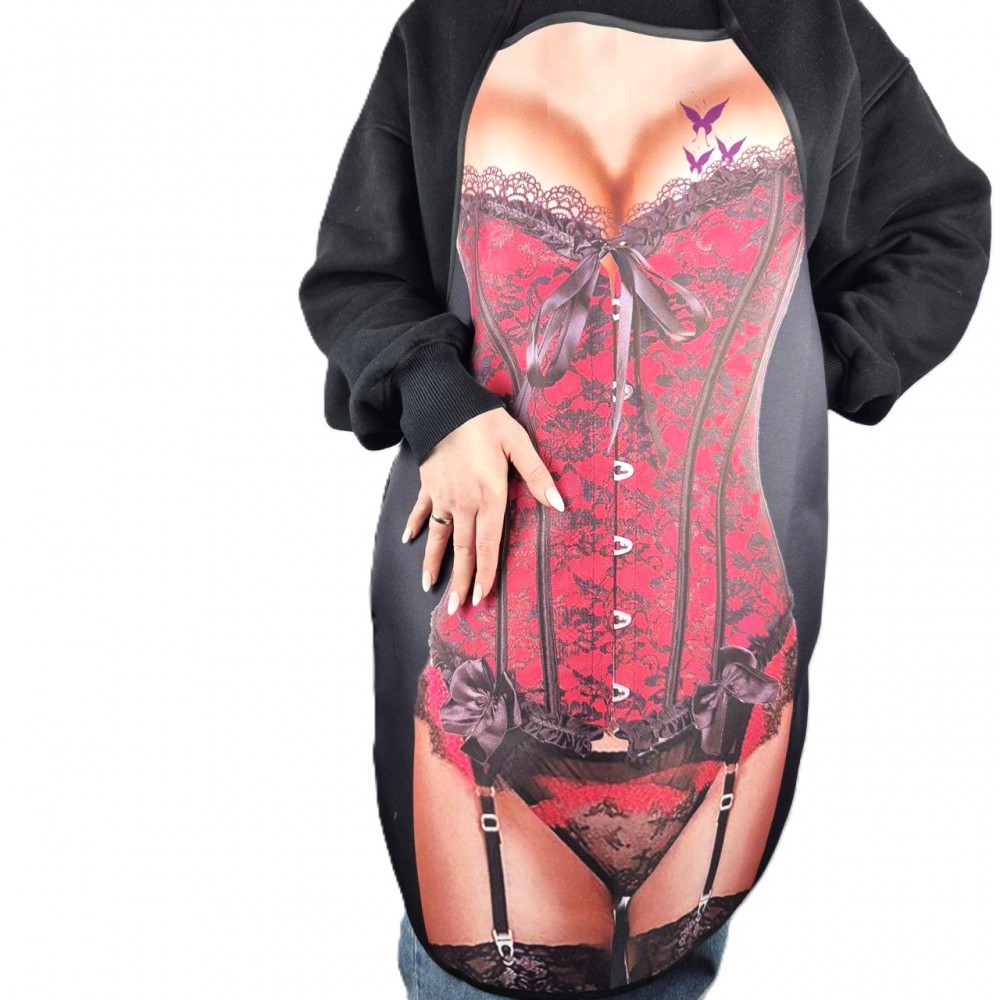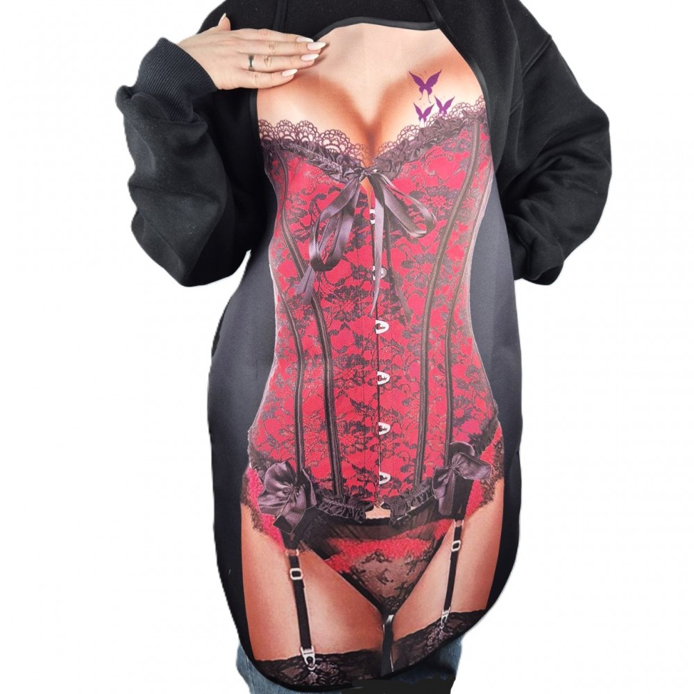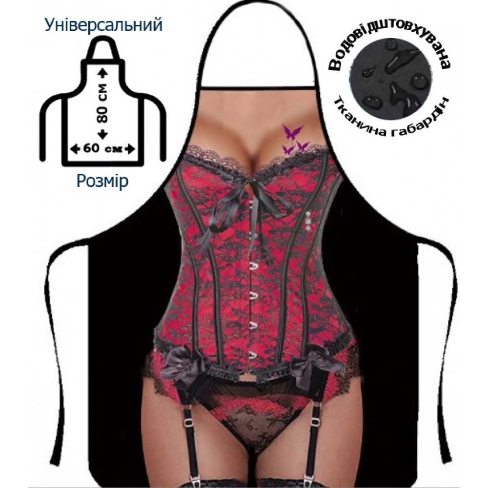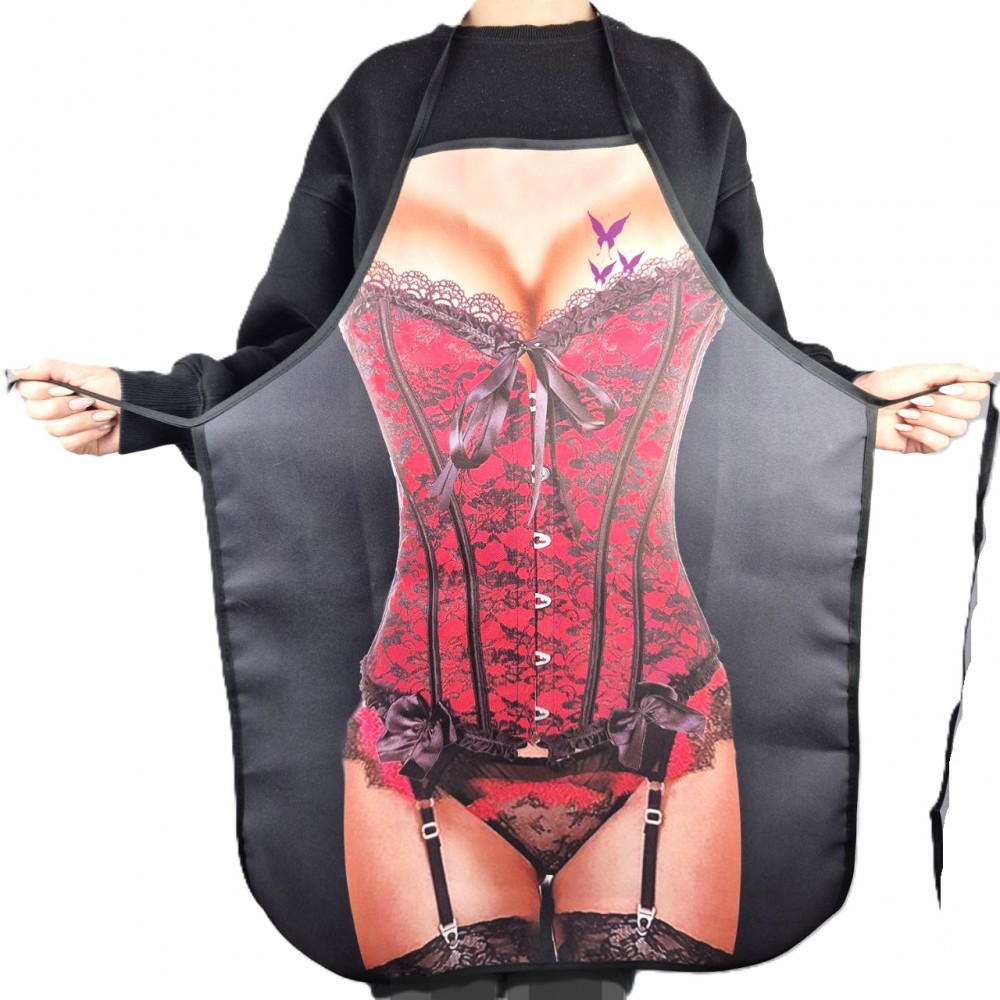 О, цей розкішний дизайн! Вогняно-червоний корсет підкреслює всі ваші достоїнства, вишукані чорні деталі додають пікантності, а панчохи... ммм... навіть мікрохвильовка починає червоніти від сорому! Цифровий друк передає кожну деталь цього гарячого образу так чітко, що оточуючі забудуть, що це всього лише фартук!