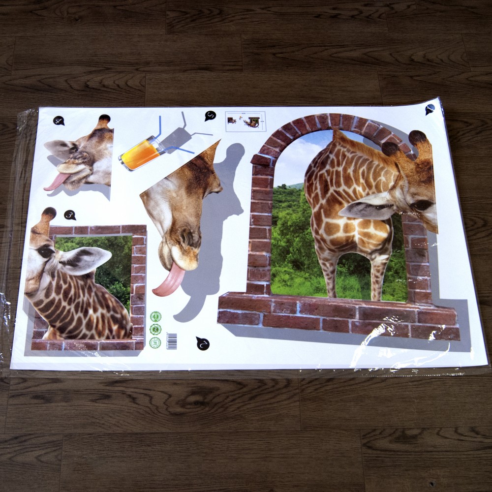 Інтер'єрна наклейка 3D Жираф та сік DLX0861 90х60см – це швидкий спосіб класно прикрасити свій будинок. Інтернет-магазин Карнавал Жартів пропонує Вам купити інтер'єрні наклейки тематики тварин, які ідеально підійдуть на кухню, спальню, вітальню, дитячу або ігрову кімнату. Прикрасу на стіну оцінять діти у своїх спальнях чи ігрових кімнатах. Інтер'єрна наклейка 3D Жираф і сік DLX0861 90х60см принтом 2 жирафи, що намагаються випити стакуанчик апельсинового соку. Розмір листа з наклейками: 60х90 см. Як 3D наклейка клеїться на стіну? Спосіб поклейки дуже простий. Для початку потрібно очистити поверхню, на яку потрібно наклеїти. Після цього знімаємо плівку і переносимо малюнок на стіну або іншу площину рукою або ганчіркою. На які поверхні можна клеїти інтер'єрну наклейку? Поклейка можлива на будь-яку ІДЕАЛЬНО ГЛАДКУ ГЛЯНЦЕВУ поверхню, наприклад: стіна пофарбована глянсовою фарбою без будь-яких рельєфів (у фарбі не повинно бути крейдяного компонента), скло, дзеркало, лаковані поверхні, гладкий пластик. На шпалери клеїти НЕ МОЖНА. Доглядати стікери на стіну також досить легко, для цього необхідно лише іноді протирати їх вологою губкою або ганчіркою. Яскравість і насиченість наклейок не змінюється з часом, крім того, вони абсолютно стійкі до вологості.