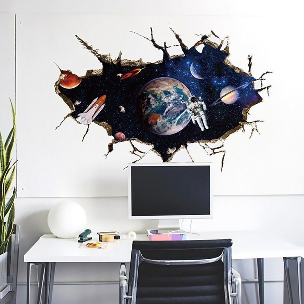 Інтер'єрна наклейка 3D Всесвіт AL8502 90х60см – це швидкий спосіб класно прикрасити свій будинок. Інтернет-магазин Карнавал Жартів пропонує Вам купити інтер'єрні наклейки космічної тематики, які ідеально підійдуть на кухню, спальню, вітальню, дитячу чи ігрову кімнату. Прикрасу на стіну оцінять діти у своїх спальнях чи ігрових кімнатах. Інтер'єрна наклейка 3D Всесвіт AL8502 90х60см принтом дірка у стіні у космос. Розмір листа з наклейками: 60х90 см. Як 3D наклейка клеїться на стіну? Спосіб поклейки дуже простий. Для початку потрібно очистити поверхню, на яку потрібно наклеїти. Після цього знімаємо плівку і переносимо малюнок на стіну або іншу площину рукою або ганчіркою. На які поверхні можна клеїти інтер'єрну наклейку? Поклейка можлива на будь-яку ІДЕАЛЬНО ГЛАДКУ ГЛЯНЦЕВУ поверхню, наприклад: стіна пофарбована глянсовою фарбою без будь-яких рельєфів (у фарбі не повинно бути крейдяного компонента), скло, дзеркало, лаковані поверхні, гладкий пластик. На шпалери клеїти НЕ МОЖНА. Доглядати стікери на стіну також досить легко, для цього необхідно лише іноді протирати їх вологою губкою або ганчіркою. Яскравість і насиченість наклейок не змінюється з часом, крім того, вони абсолютно стійкі до вологості.