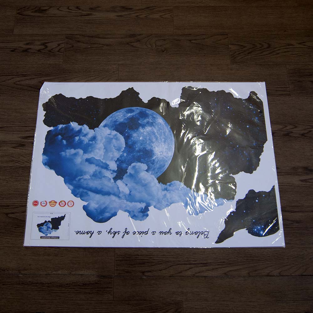 Інтер'єрна наклейка 3D Місяць XC7001 70х50см – це швидкий спосіб класно прикрасити свій будинок. Інтернет-магазин Карнавал Жартів пропонує Вам купити інтер'єрні наклейки космічної тематики, які ідеально підійдуть на кухню, спальню, вітальню, дитячу чи ігрову кімнату. Прикрасу на стіну оцінять діти у своїх спальнях чи ігрових кімнатах. Інтер'єрна наклейка 3D Місяць XC7001 70х50см з принтом місяця та нічного неба крізь стіну. Розмір листа з наклейками: 70х50 см. Як 3D наклейка клеїться на стіну? Спосіб поклейки дуже простий. Для початку потрібно очистити поверхню, на яку потрібно наклеїти. Після цього знімаємо плівку і переносимо малюнок на стіну або іншу площину рукою або ганчіркою. На які поверхні можна клеїти інтер'єрну наклейку? Поклейка можлива на будь-яку ІДЕАЛЬНО ГЛАДКУ ГЛЯНЦЕВУ поверхню, наприклад: стіна пофарбована глянсовою фарбою без будь-яких рельєфів (у фарбі не повинно бути крейдяного компонента), скло, дзеркало, лаковані поверхні, гладкий пластик. На шпалери клеїти НЕ МОЖНА. Доглядати стікери на стіну також досить легко, для цього необхідно лише іноді протирати їх вологою губкою або ганчіркою. Яскравість і насиченість наклейок не змінюється з часом, крім того, вони абсолютно стійкі до вологості.