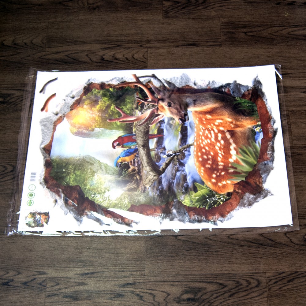 Інтер'єрна наклейка 3D Олень XH7253 70х50см – це швидкий спосіб класно прикрасити свій будинок. Інтернет-магазин Карнавал Жартів пропонує Вам купити інтер'єрні наклейки космічної тематики, які ідеально підійдуть на кухню, спальню, вітальню, дитячу чи ігрову кімнату. Прикрасу на стіну оцінять діти у своїх спальнях чи ігрових кімнатах. Інтер'єрна наклейка 3D Олень XH7253 70х50см принтом дірка у стіні у космос. Розмір листа з наклейками: 50х70 см. Як 3D наклейка клеїться на стіну? Спосіб поклейки дуже простий. Для початку потрібно очистити поверхню, на яку потрібно наклеїти. Після цього знімаємо плівку і переносимо малюнок на стіну або іншу площину рукою або ганчіркою. На які поверхні можна клеїти інтер'єрну наклейку? Поклейка можлива на будь-яку ІДЕАЛЬНО ГЛАДКУ ГЛЯНЦЕВУ поверхню, наприклад: стіна пофарбована глянсовою фарбою без будь-яких рельєфів (у фарбі не повинно бути крейдяного компонента), скло, дзеркало, лаковані поверхні, гладкий пластик. На шпалери клеїти НЕ МОЖНА. Доглядати стікери на стіну також досить легко, для цього необхідно лише іноді протирати їх вологою губкою або ганчіркою. Яскравість і насиченість наклейок не змінюється з часом, крім того, вони абсолютно стійкі до вологості.