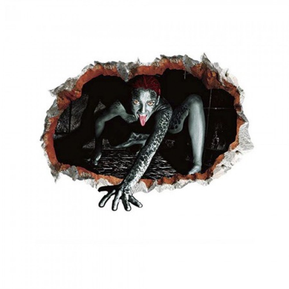 Інтер'єрна наклейка Діра у стіні Ліліт (45х60см) – це швидкий спосіб класно прикрасити свій будинок. Інтернет - магазин Карнавал Жартів пропонує Вам купити інтер'єрні наклейки хорор тематики, які ідеально підійдуть на кухню, спальню, вітальню, дитячу чи ігрову кімнату. Прикраса на стіну оцінять у кімнаті страху або декара Хеллоуїн. Як 3D наклейка клеїться на стіну? Спосіб поклейки дуже простий. Для початку потрібно очистити поверхню, на яку потрібно наклеїти. Після цього знімаємо плівку і переносимо малюнок на стіну або іншу площину рукою або ганчіркою. На які поверхні можна клеїти інтер'єрну наклейку? Поклейка можлива на будь-яку ІДЕАЛЬНО ГЛАДКУ ГЛЯНЦЕВУ поверхню, наприклад: стіна пофарбована глянсовою фарбою без будь-яких рельєфів (у фарбі не повинно бути крейдяного компонента), скло, дзеркало, лаковані поверхні, гладкий пластик. На шпалери клеїти НЕ МОЖНА. Доглядати стікери на стіну також досить легко, для цього необхідно лише іноді протирати їх вологою губкою або ганчіркою. Яскравість і насиченість наклейок не змінюється з часом, крім того, вони абсолютно стійкі до вологості.