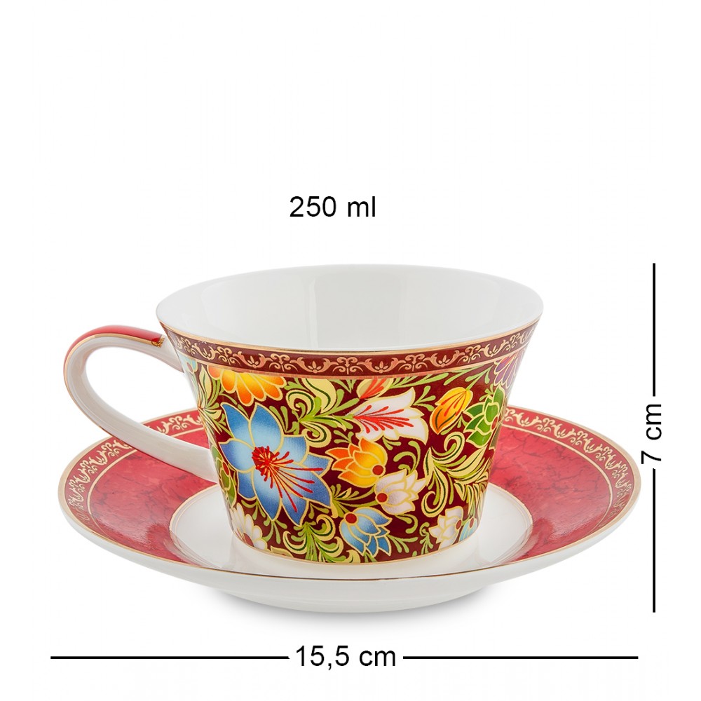 Размер чайной пары: 15,5 х 7 см; объем чашечки: 0,25л. ;